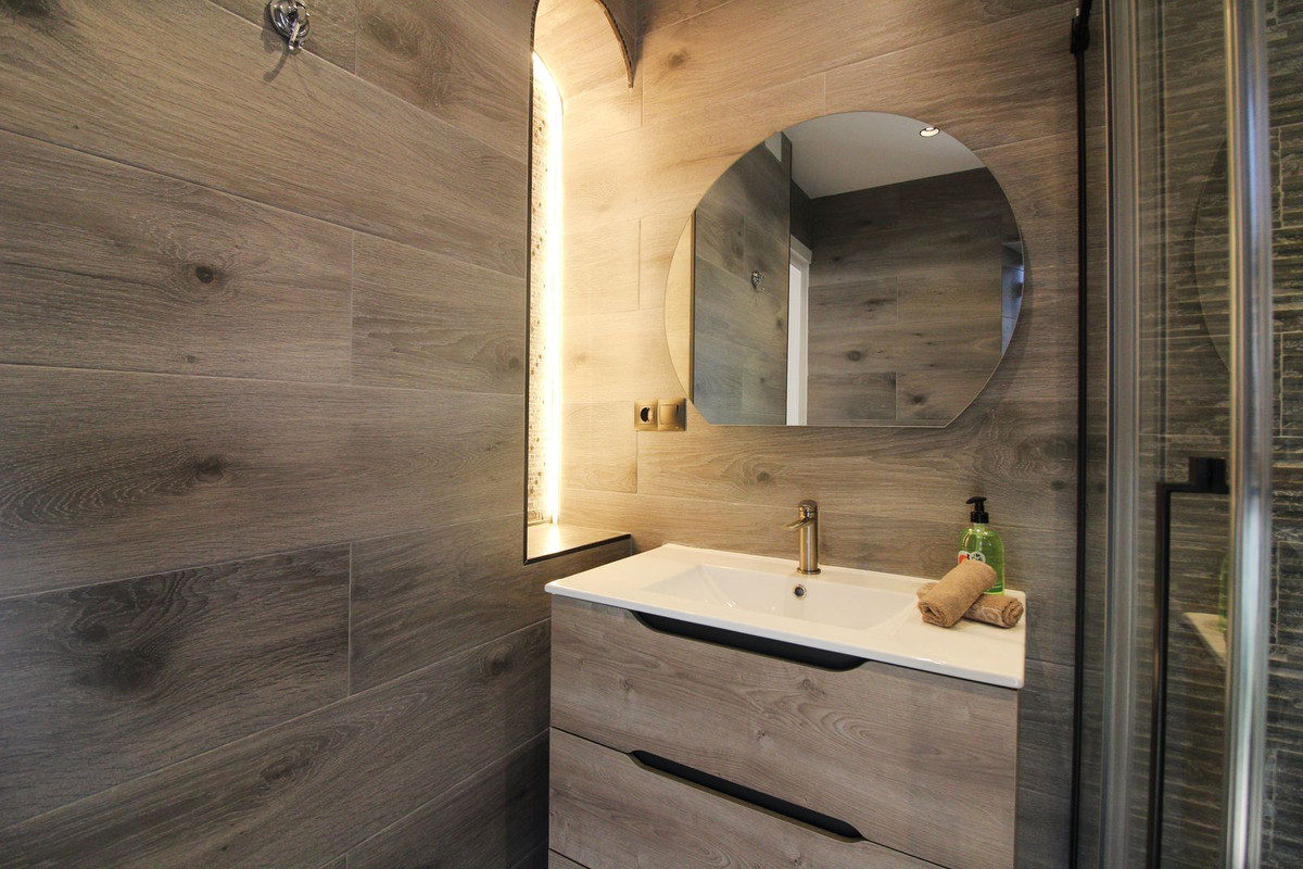 Distributed on a single level, the villa features three spacious bedrooms, all with en-suite bathrooms, a generous living-dining room, a fully equipped kitchen, a private garage, and a garden with an outdoor pool. Several rooms enjoy open views of the mountains.