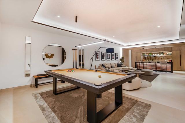 Le niveau inférieur de la villa est dédié aux loisirs et aux divertissements, avec un espace salon, un bar, un billard et deux suites supplémentaires. Ce niveau donne également accès à un garage privé pouvant accueillir trois voitures, équipé de bornes de recharge pour voitures électriques.