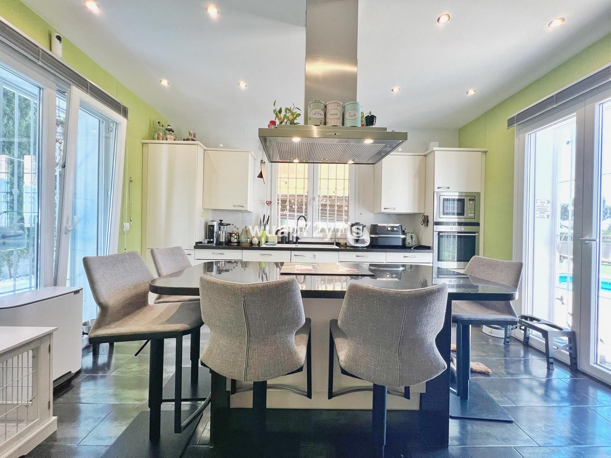 As you enter the villa, you are welcomed by a spacious entrance hall that leads into a large, open-plan living and dining area filled with natural light. The layout is designed to create a seamless flow between indoor and outdoor living, with large windows offering stunning views and direct access to the garden and pool area. To the left, behind elegant sliding doors, you’ll find a modern and fully equipped kitchen that combines functionality and style, ideal for both everyday life and entertaining guests.