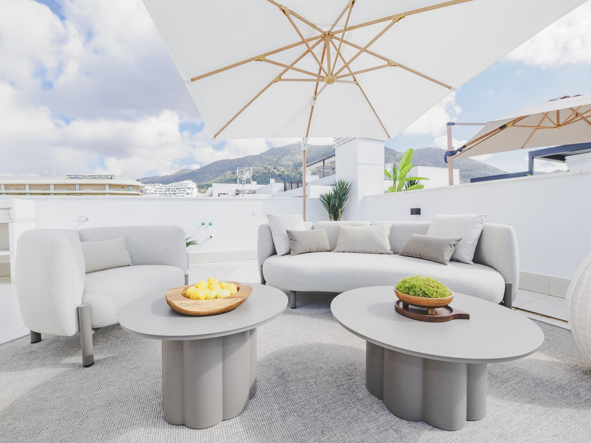 The penthouse features two spacious bedrooms, an open-plan designer kitchen integrated into a bright living-dining room. From this room, you can access the 27 m² main terrace, which in turn connects to a private solarium equipped with a barbecue and a four-person jacuzzi, ideal for enjoying the climate and views of the Costa del Sol.