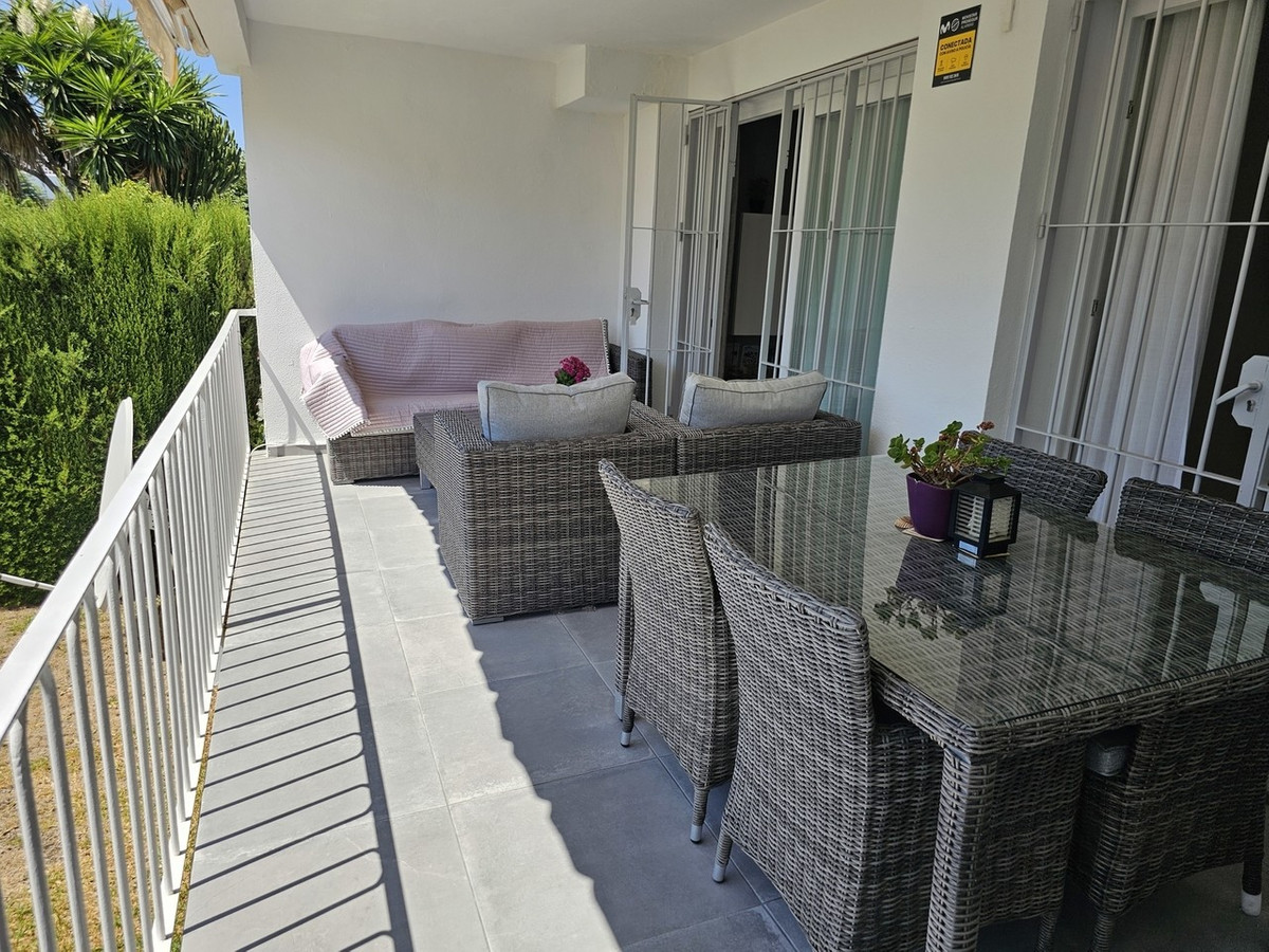Further down the hallway, a fully fitted kitchen sits on the left, complete with access to a second, 11m2 garden space—perfect for morning coffee. Thanks to its south-facing orientation, the apartment remains light-filled throughout the day, creating a welcoming and cheerful atmosphere. Location is another standout-just 15 minutes from Marbella and Estepona, and between 4 to 8 minutes from El Paraiso and Atalaya Golf clubs. It's a mere 10 to 15-minute stroll to the beach, with shops, restaurants, and essential services only steps away.