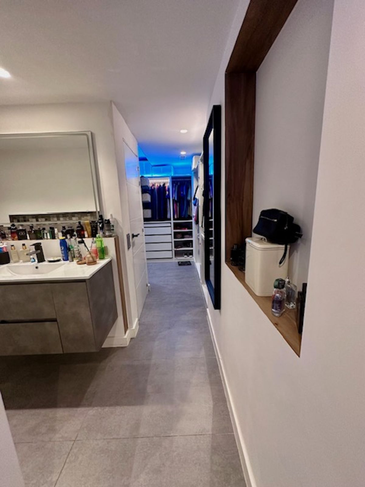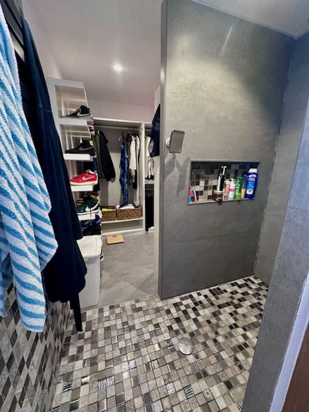The master bedroom, ultra-modern, has been divided into two parts: a bathroom area with a shower, and a separate toilet area (his and hers).
