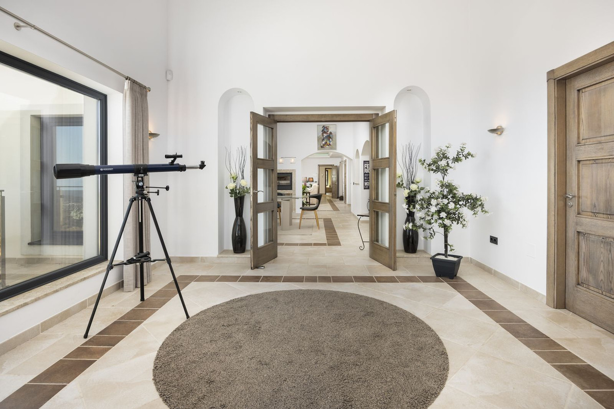 The villa features underfloor heating, hot and cold A/C, tempered glass windows throughout, and solar panels for both water and underfloor heating. There are two lifts: one from the entrance to the garage, and another to the rooftop terrace with jacuzzi. Outdoors, you’ll find an infinity pool, children’s pool, extensive terraces, and a large outdoor kitchen.