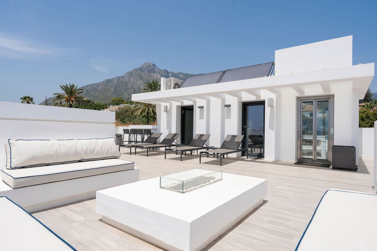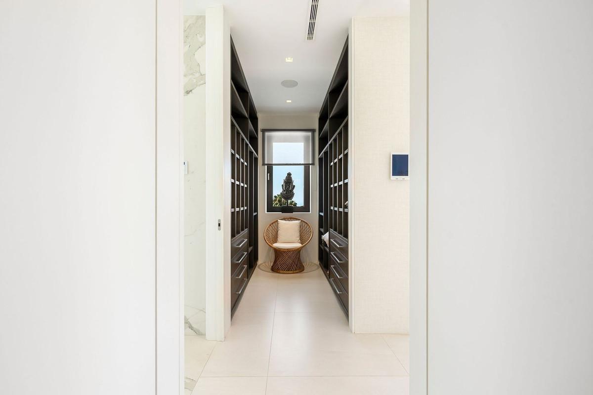 A stunning modern luxury Villa in Nagueles, Marbella Golden Mile offering easy access to Marbella centre and just 10 minutes’ drive from Puerto Banus. The property is built to the highest specifications with great attention to detail and using top quality materials and installations throughout. The villa is distributed over three levels all connected with an elevator including basement area, plus a spacious solarium roof terrace. The basement level includes private garage with turntable mechanism, entertainment area with TV lounge, a full-size bar, lounge; good sized staff/guest bedroom with en-suite bathroom, laundry room, guest WC and technical room. The entrance level comprises of entrance hall, guest WC, one bedroom suite, spacious lounge, an office, dining area and open plan kitchen which opens out onto the large terrace leading to the private pool. The master bedroom is located on the first floor and includes a large en-suite bathroom and dressing room. This floor also includes 2 additional bedroom suites. The rooftop terrace of 98m² offers panoramic sea and mountain views and is ideal for outdoor entertaining and also includes a chill-out area, bathroom and storage.