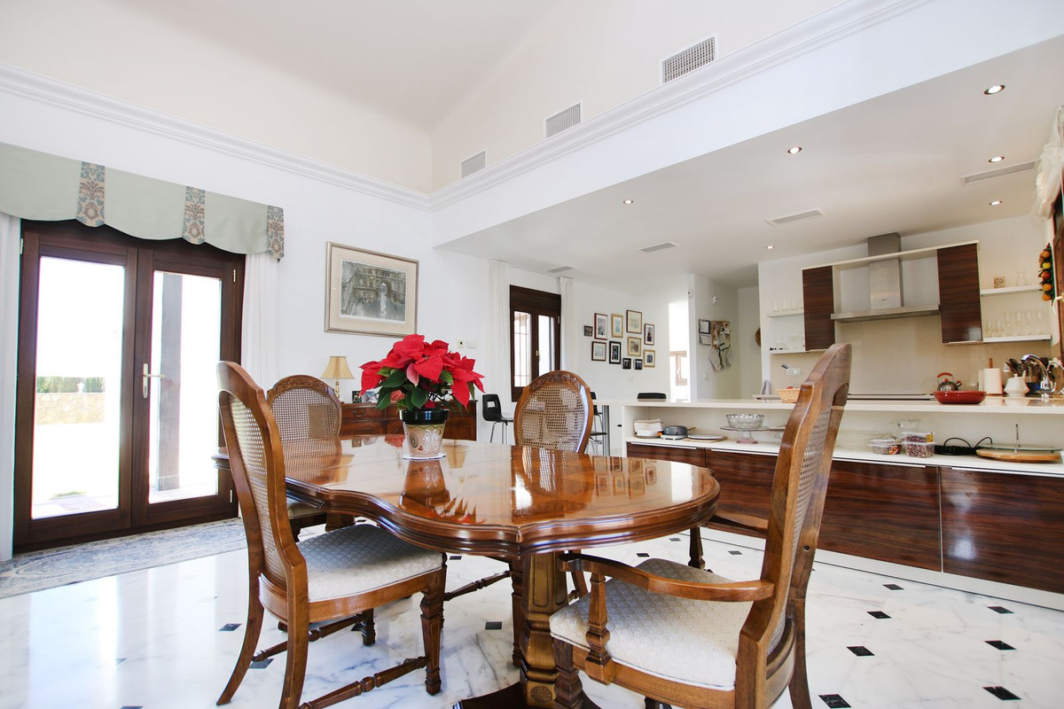 Entering the villa, the immediate impression is one of space and light . The entrance hall having floor to ceiling glass windows that look directly out the garden and swimming pool beyond. A large wrought iron and wood staircase with a gallery landing above is a stunning focal point to the home . The hallway is large and could also be used as a small reception room .