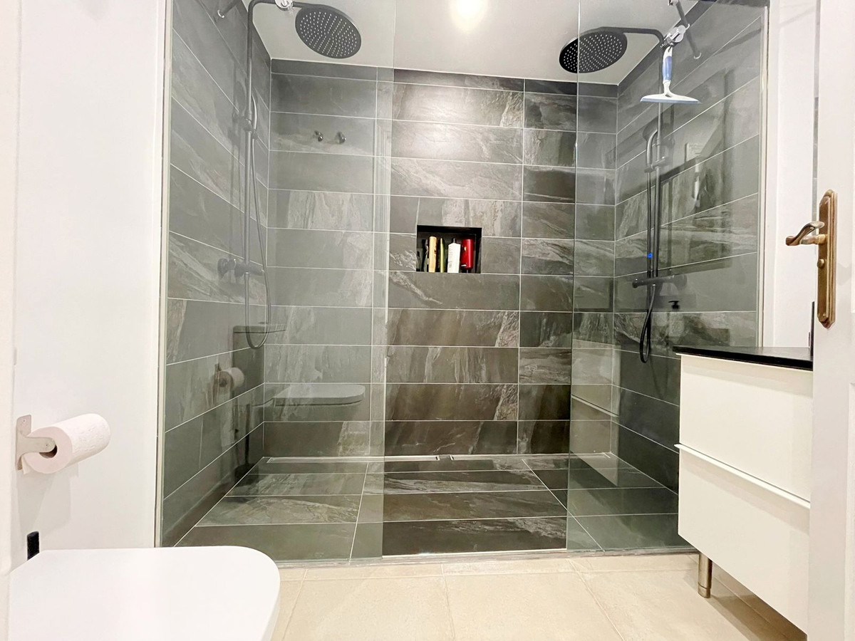 • A welcoming entrance leads to 2 bedrooms and a modernised guest bathroom with a wide walk-in shower, designed with dual shower heads for a touch of luxury.