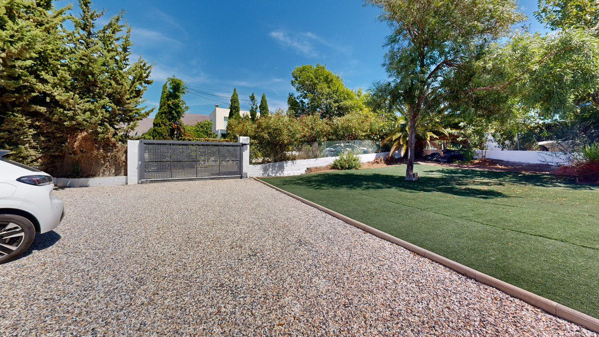 Outdoors, two electric gates provide access to a spacious parking area with room for more than five vehicles. A large partially covered patio completes this Mediterranean paradise, offering an ideal setting to enjoy the sun, peace, and outdoor living all year round.