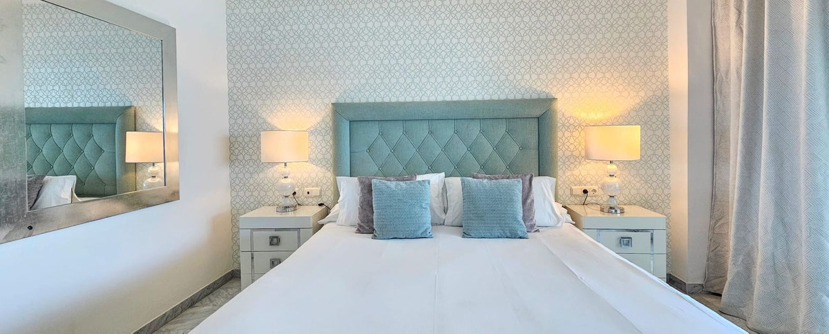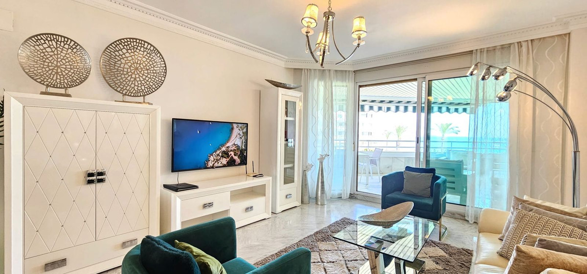 Beautiful apartment in a gated community Playa Esmeralda, located on beachfront, in Golden Mile, Marbella. The apartment has 2 bedrooms, 2 bathrooms (one in-suite), living room with access to the spacious terrace with amazing view to the sea, beach and gardens. Kitchen is equipped with all appliances. In the urbanization there is two swimming pools, beautiful gardens, gym, direct access to the beach and 24 hours security sistem with camaras.