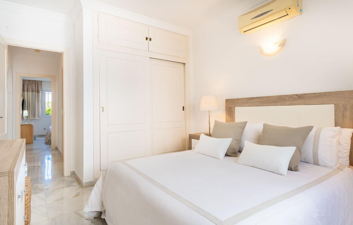 Impressive guest double bedroom with a renovated ensuite bathroom. Air-conditioning installed throughout all main rooms. The property exterior terrace is covered for protection and equipped with extendable awning over the exquisite garden area equipped with a high standard rattan dining suite and sun beds.