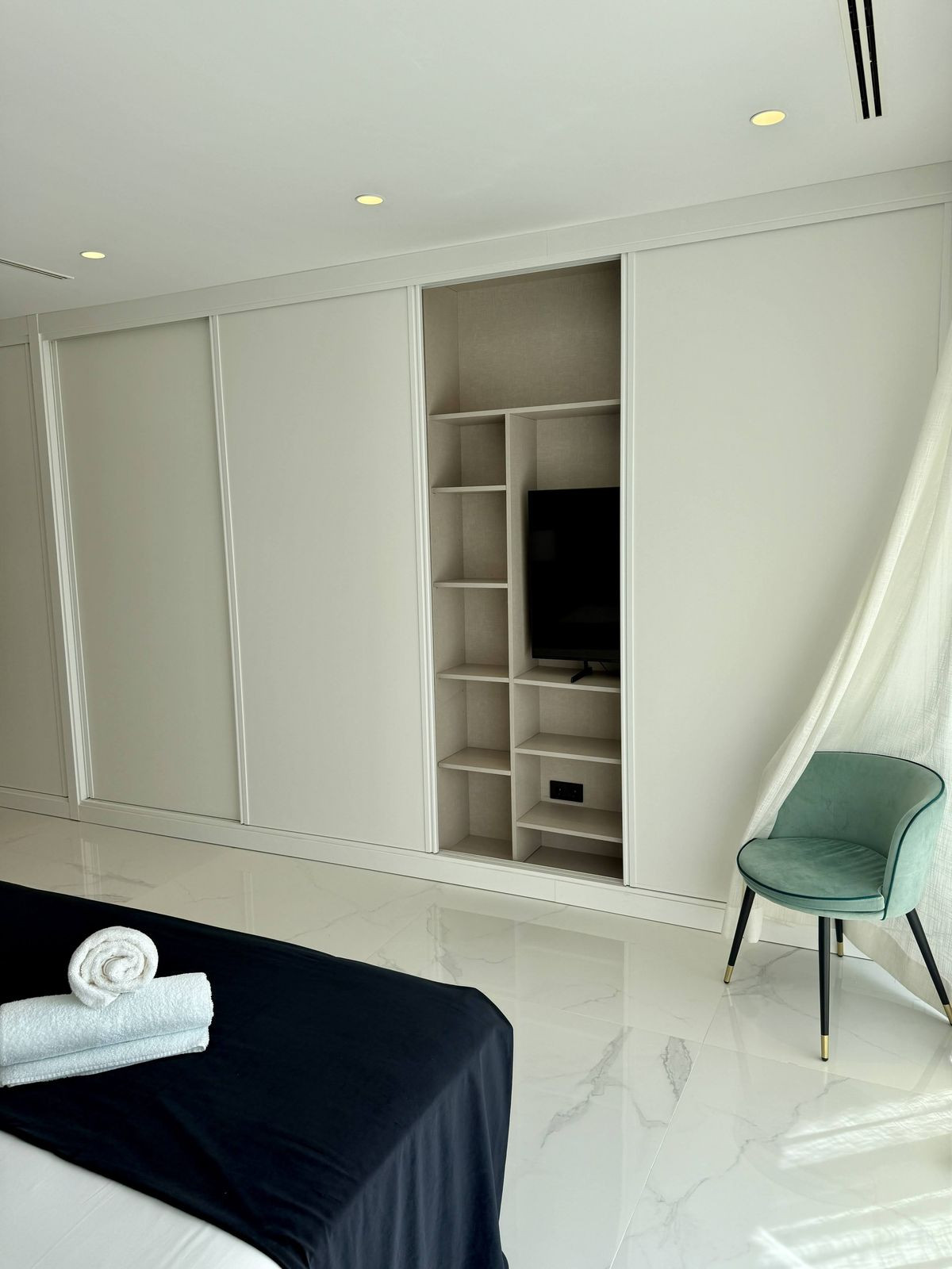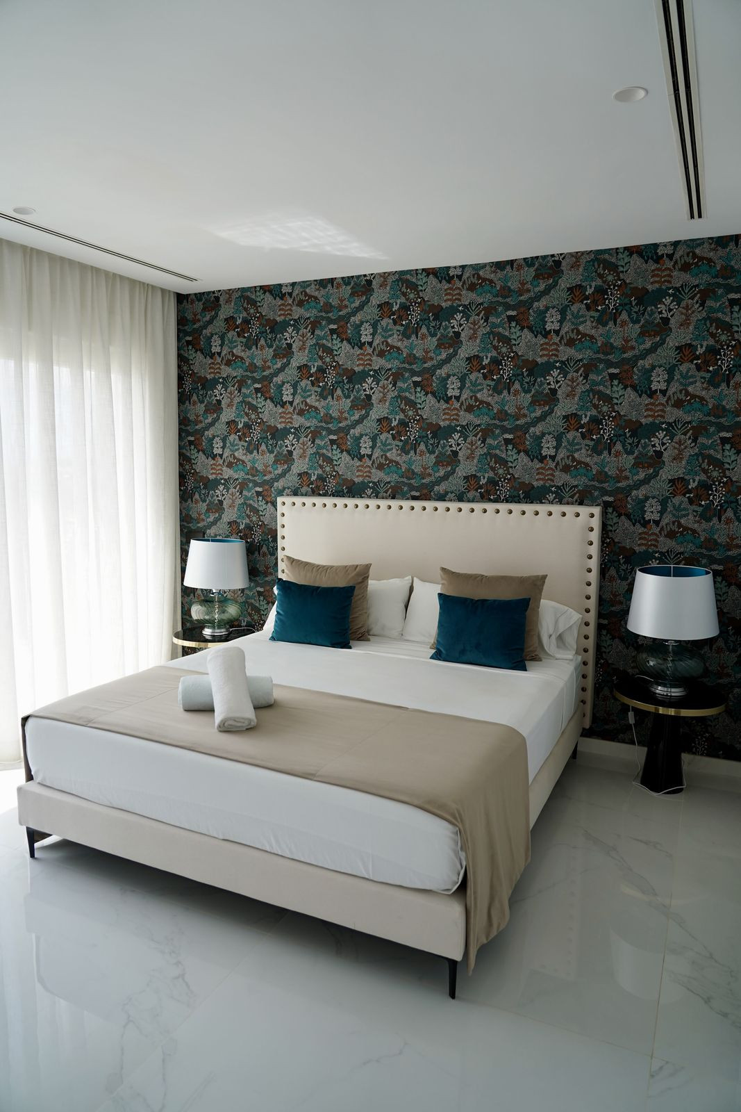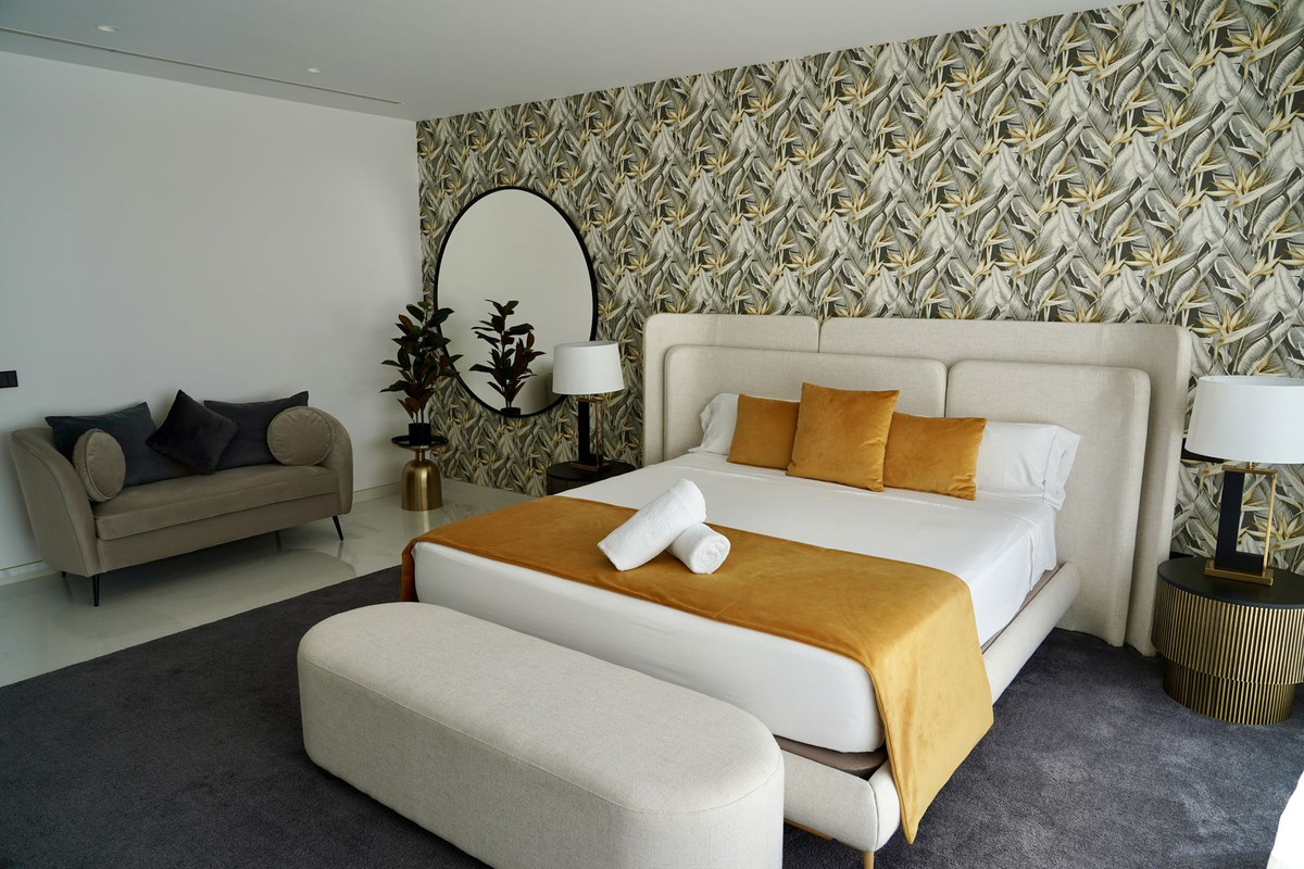 Indoors, the villa features bright, open spaces equipped with home automation, air conditioning, marble floors, jacuzzi, gym, games room, wine cellar, staff accommodation, and a fully fitted kitchen. The property is sold fully furnished with carefully selected high-end pieces.