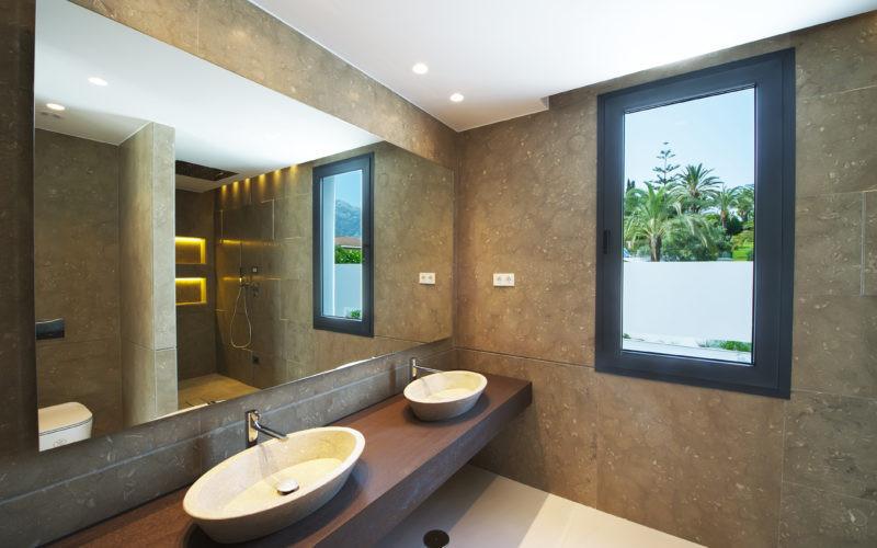 This modern Villa is built to very exacting standards and features a lift to all floors, stunning double height entrance hall, huge entertaining areas, unique water features and unrivalled views of the surrounding valley and out to sea. The Bulthaup designed kitchen and Schüco sliding doors and windows represent the best of German engineering with a style that is unbeatable. 2 en suite bedrooms and designer kitchen with open plan living room and dining room with fireplace. Large entrance Hall with double height ceilings looking through a glass wall on to the fountain and infinity swimming pool.