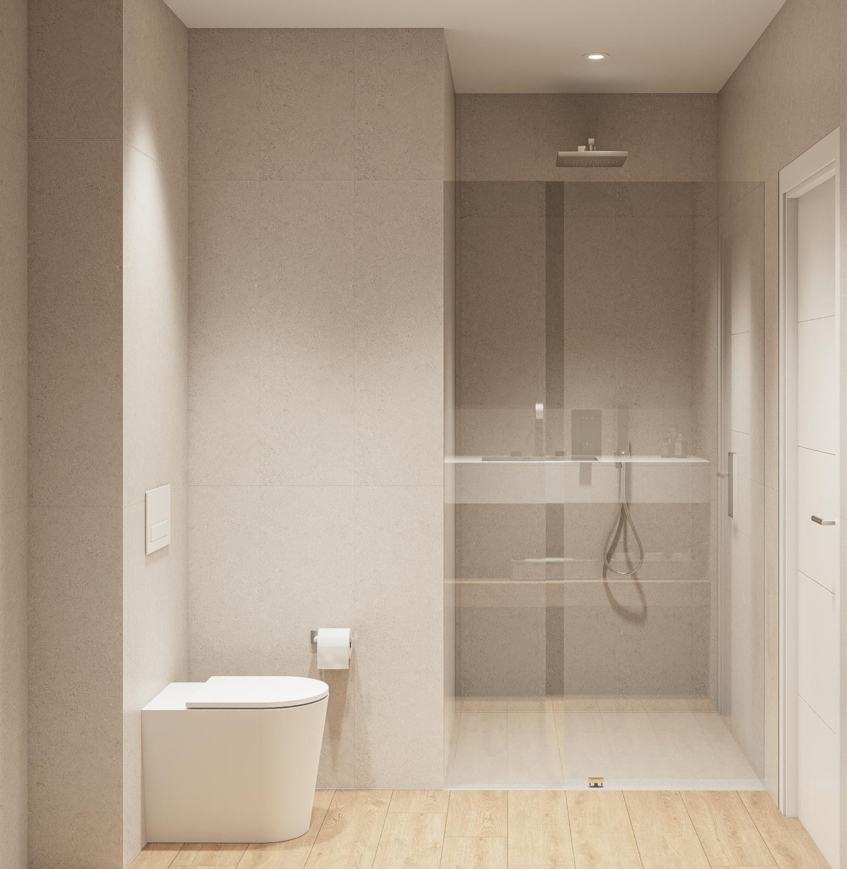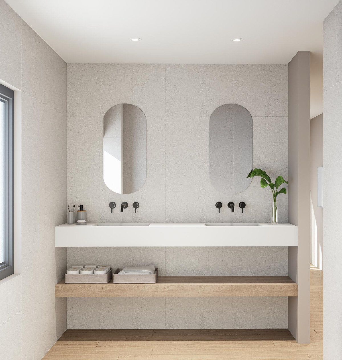 The apartment features two bedrooms, both with built-in wardrobes and modern finishes. The master bedroom has a large private bathroom with a spacious shower, while the second bathroom is also fully equipped and maintains the same contemporary design. Finishes include porcelain flooring in wet areas and double glazing on all windows, ensuring comfort and efficiency.
