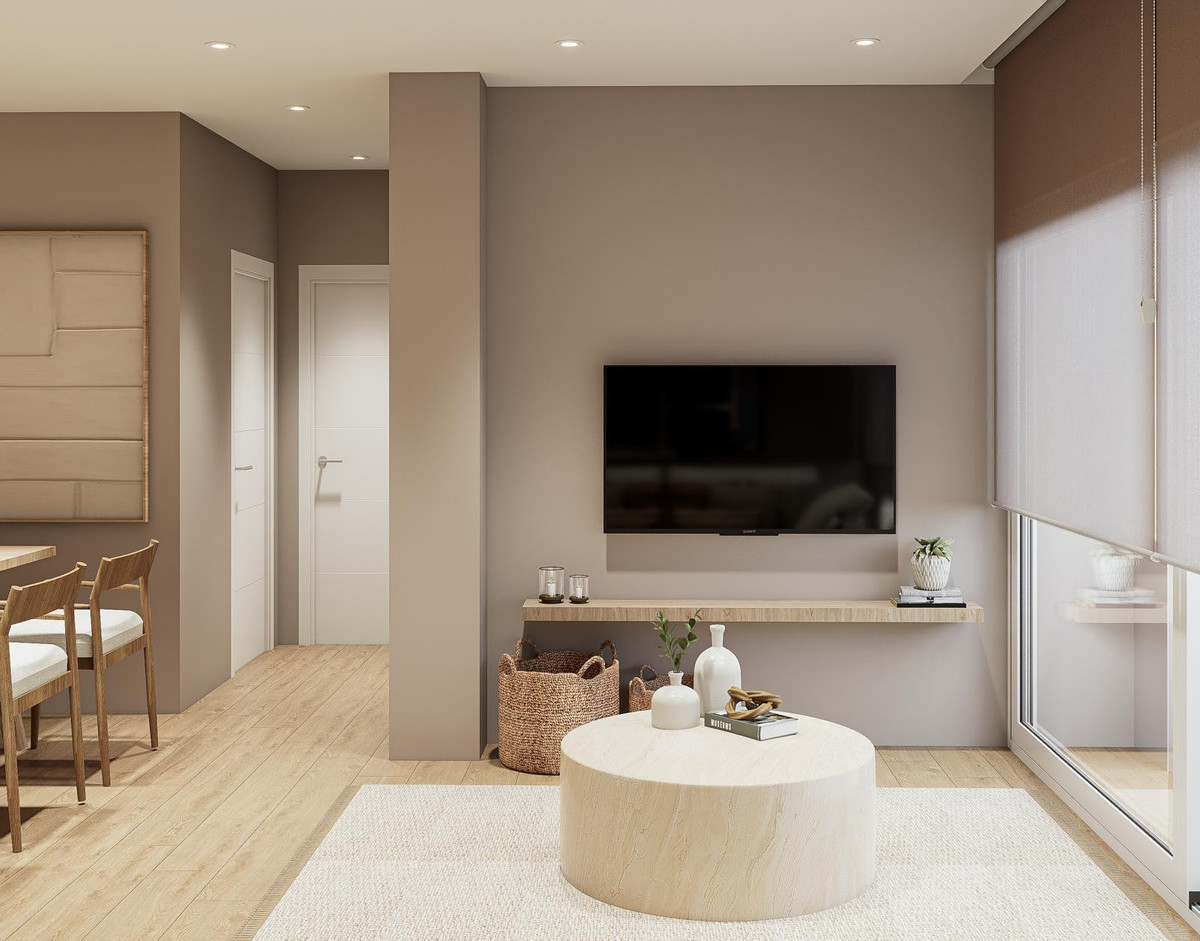 The main area of the property consists of an open-plan living room with an integrated dining area, providing a spacious and bright atmosphere. The parquet flooring and large windows with glass doors add warmth and light to the space. The kitchen, fully equipped and designed in an open-plan style with a peninsula, is integrated into the social area, facilitating interaction and optimal use of space. From the living room, there is access to a balcony-style terrace of approximately 7m², ideal for enjoying the side sea views and the Costa del Sol climate.