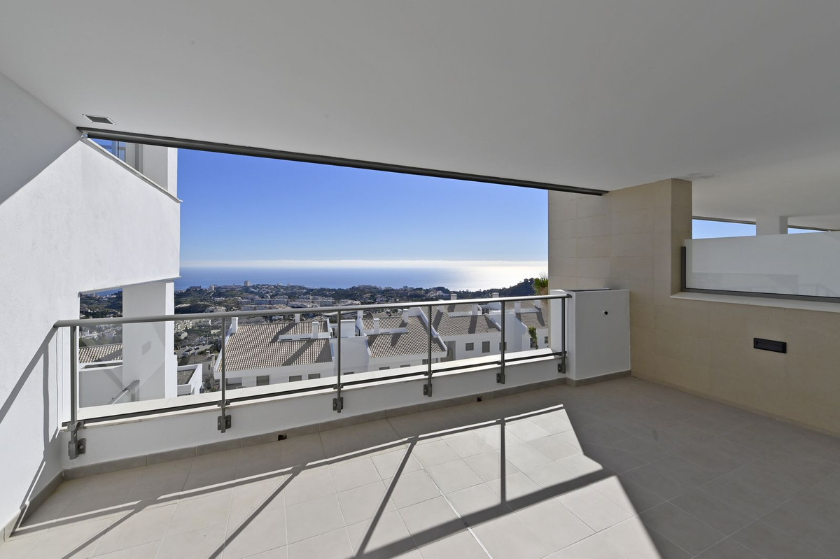 The property has 3 bedrooms with fitted wardrobes and 2 full bathrooms, one of which is en suite in the master bedroom, a living room leading to a large 24.88 m² south-facing terrace with unobstructed sea views.