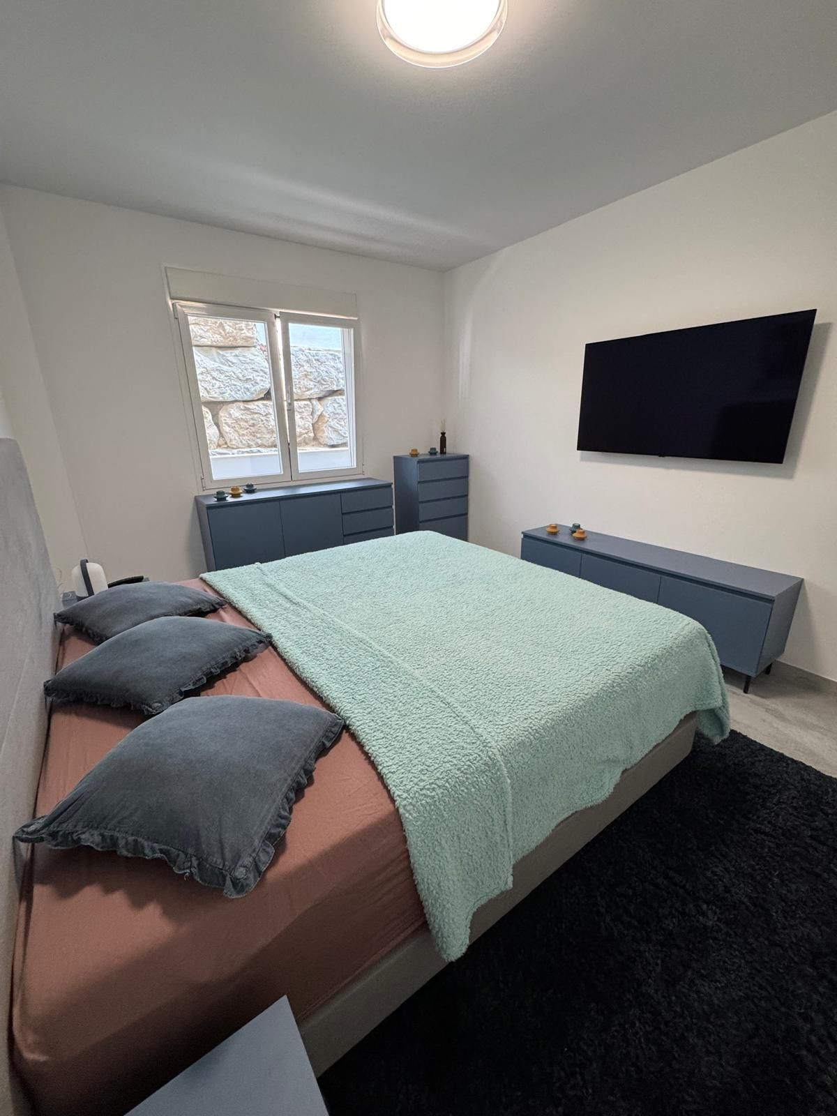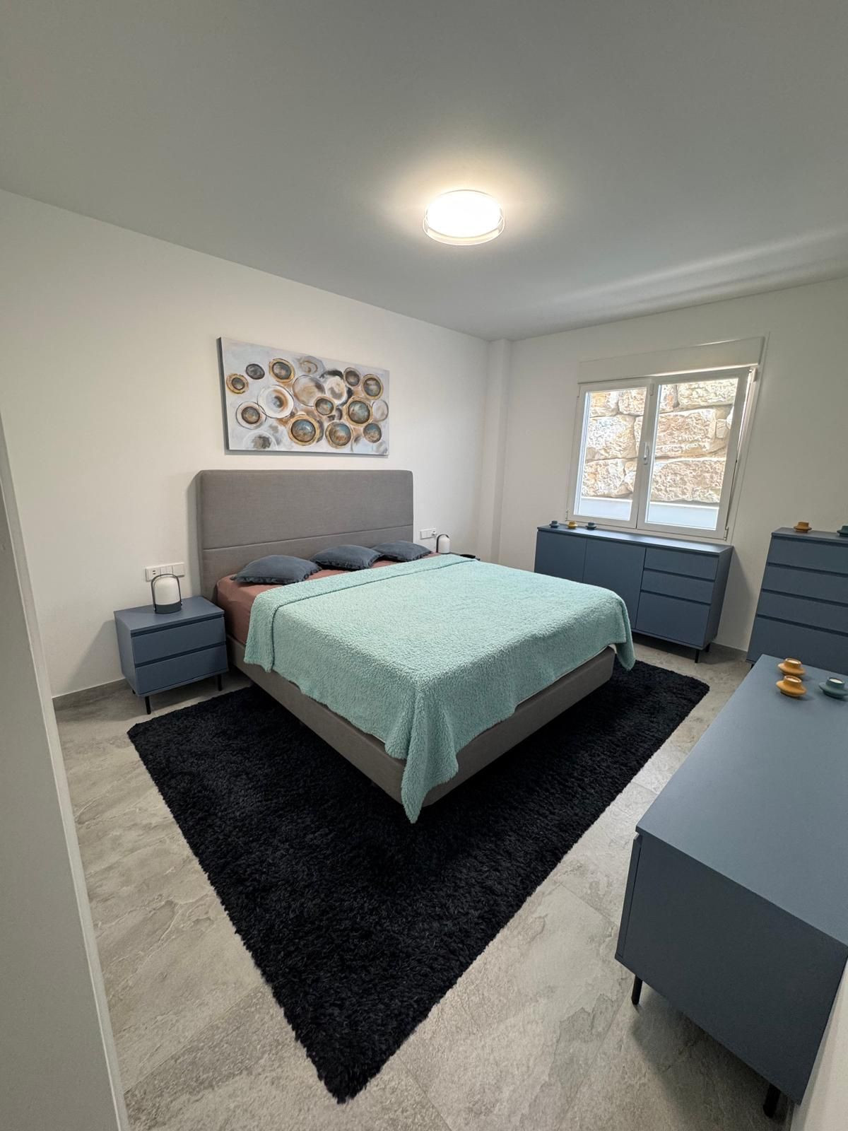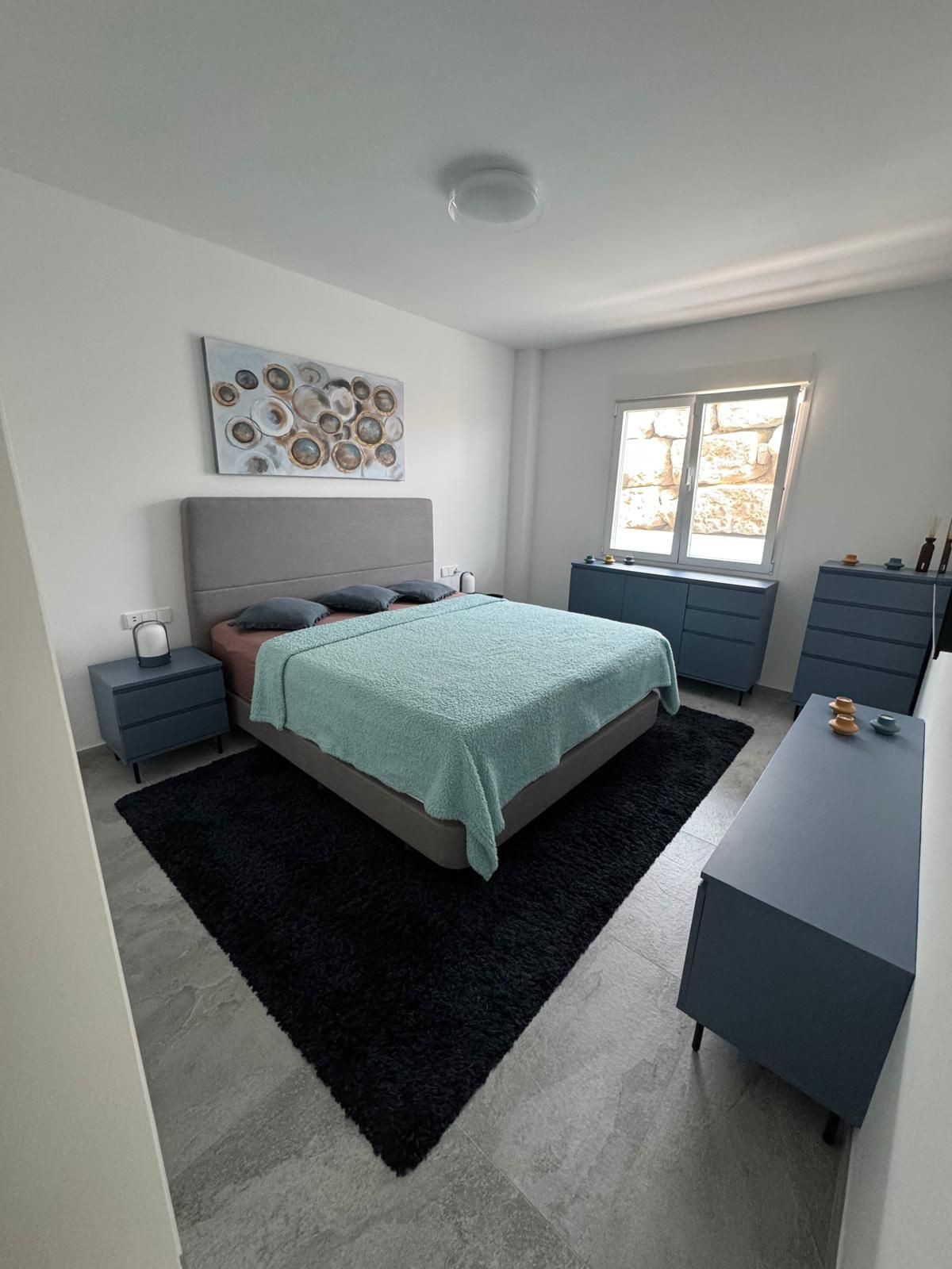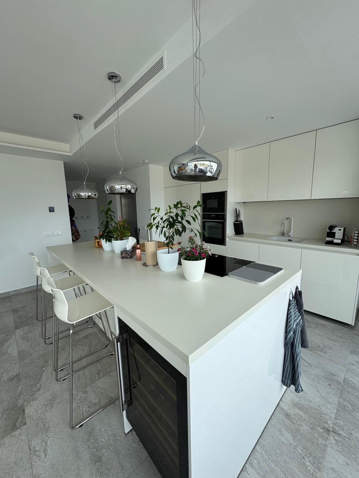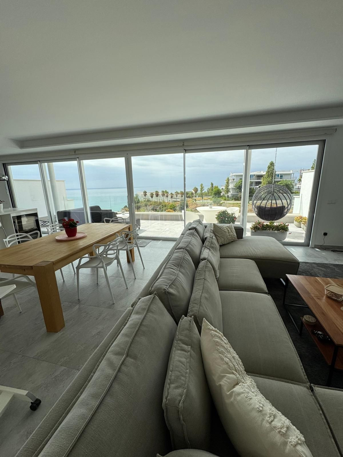 The modern kitchen equipped with top-of-the-line NEFF appliances also features a large island, connecting it with the bright living and dining areas. The living room terrace offers a tranquil space to relax or enjoy a sunset dinner, while the glass railing ensures unobstructed panoramic views of the sea.