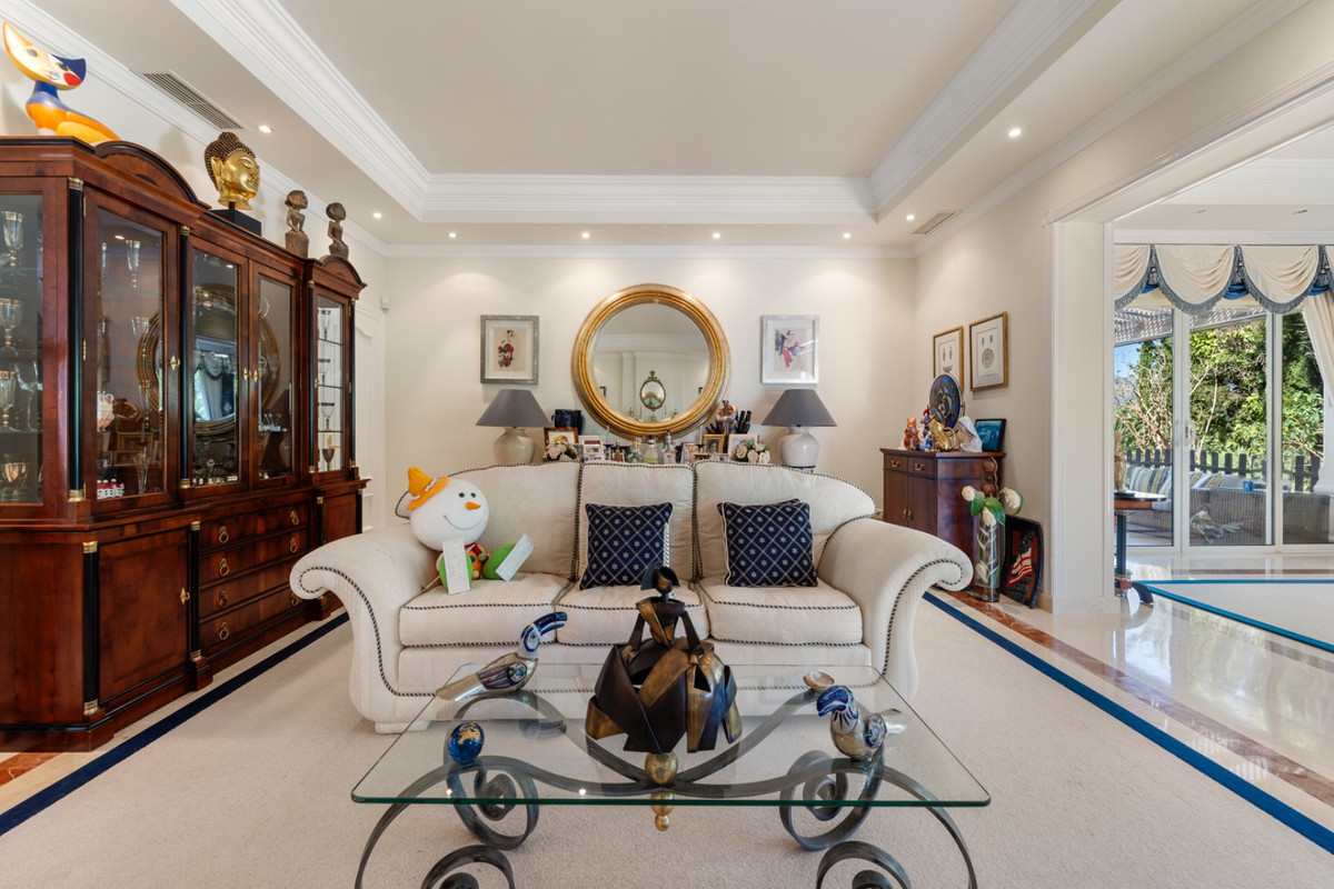 Villa Alto sits proudly within one of the coast’s most exclusive gated communities, surrounded by a world-class golf course and protected by 24-hour security. This elegant five-bedroom villa combines privacy, space, and style across three levels, offering panoramic views of La Concha mountain and the lush golf valley.