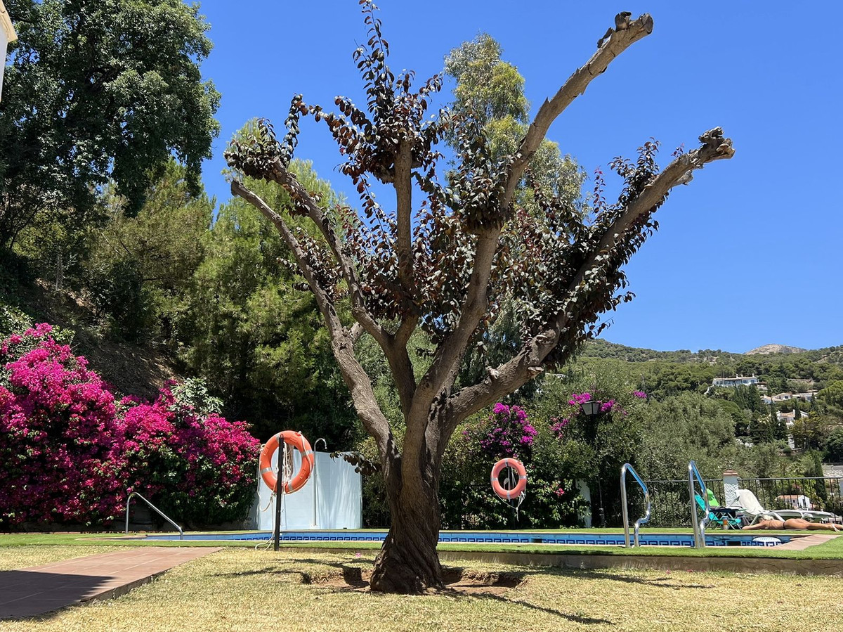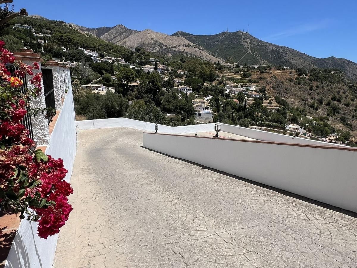 Entrance hall. Lounge-dining room with A/C h+c, ceiling fan and sliding doors to enclosed sunny terrace with folding glass curtains. Shower room. Master bedroom with wardrobes and sliding doors to the enclosed terrace. This sunny enclosed terrace could be a reading room or study if needed. Double glazing. Roller blinds. Marble floors. Ceiling fans. Guest bedroom also has fitted wardrobes. Full bathroom. Fully fitted kitchen with glass-ceramic hob, fridge-freezer, oven, extractor fan and granite counter-top. Small front patio has spiral stairs that lead up to spacious ROOF-TOP TERRACE with those outstanding PANORAMIC views to the whole coast. There are new storage units, an outdoor shower, and plenty of space for BBQ and dining “al fresco”– a great place to chill out. Communal swimming pool, well-maintained gardens and a designated parking space. All within a peaceful gated complex only a short walk from Mijas center. Walking distance to all amenities. Near bus stop. VIEWINGS RECOMMENED!