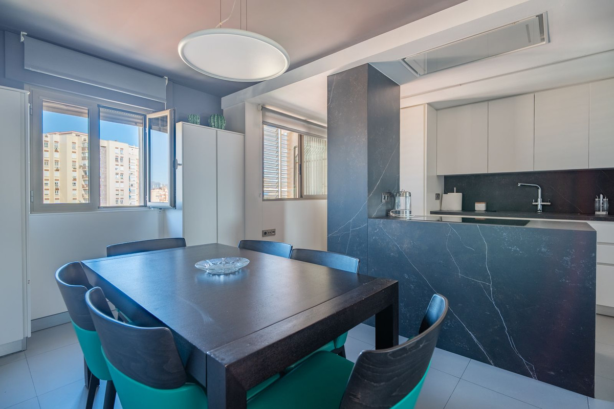 The spacious living-dining room, filled with natural light, opens onto a magnificent 30 m² terrace designed for enjoyment: whether for breakfast in the sun, dinner at sunset or simply relaxing. From this terrace, you can access a 200 m² private solarium, a unique space with breathtaking panoramic views of the city of Malaga, ideal for creating a chill-out area, installing a small swimming pool or urban garden.