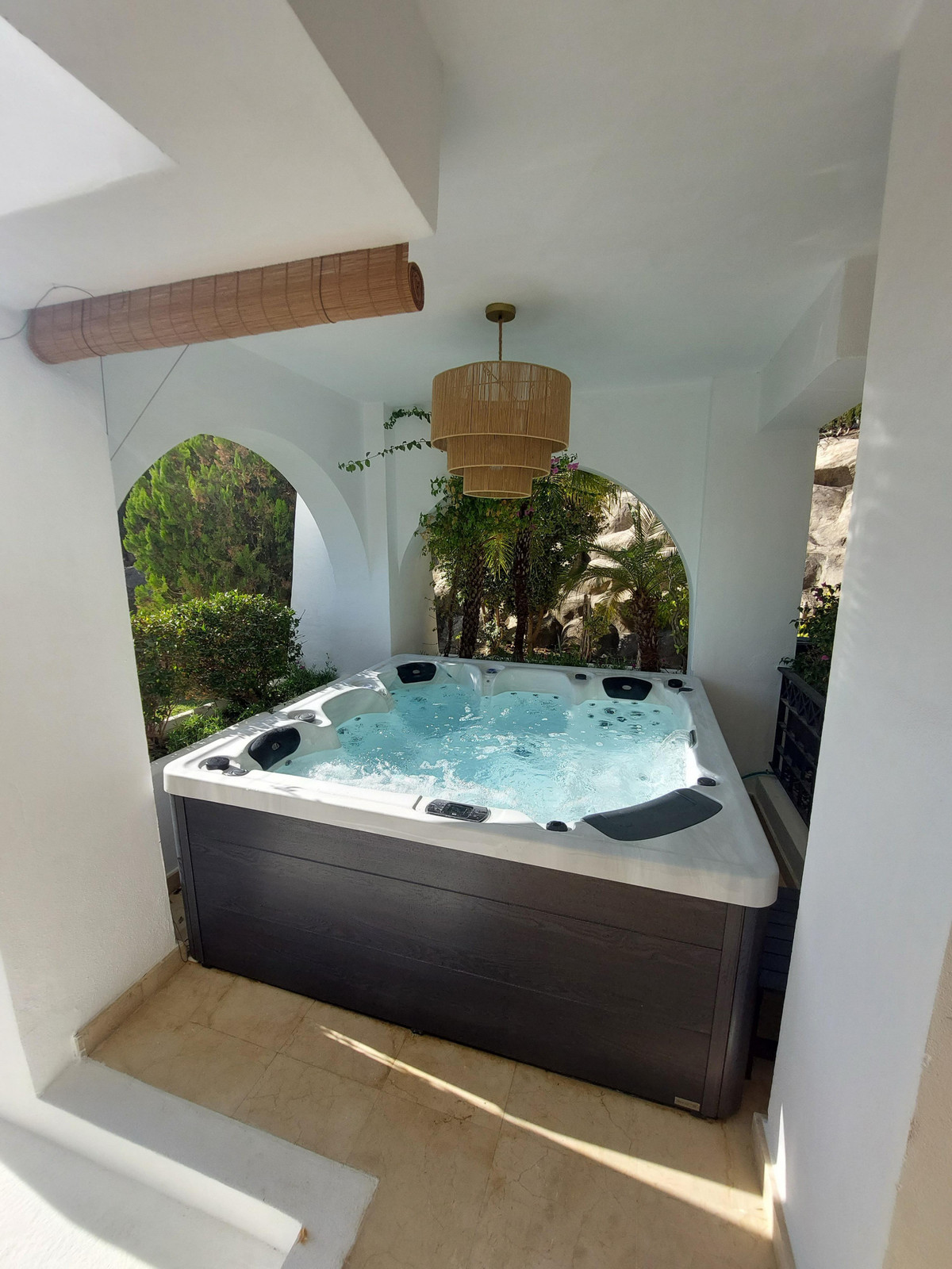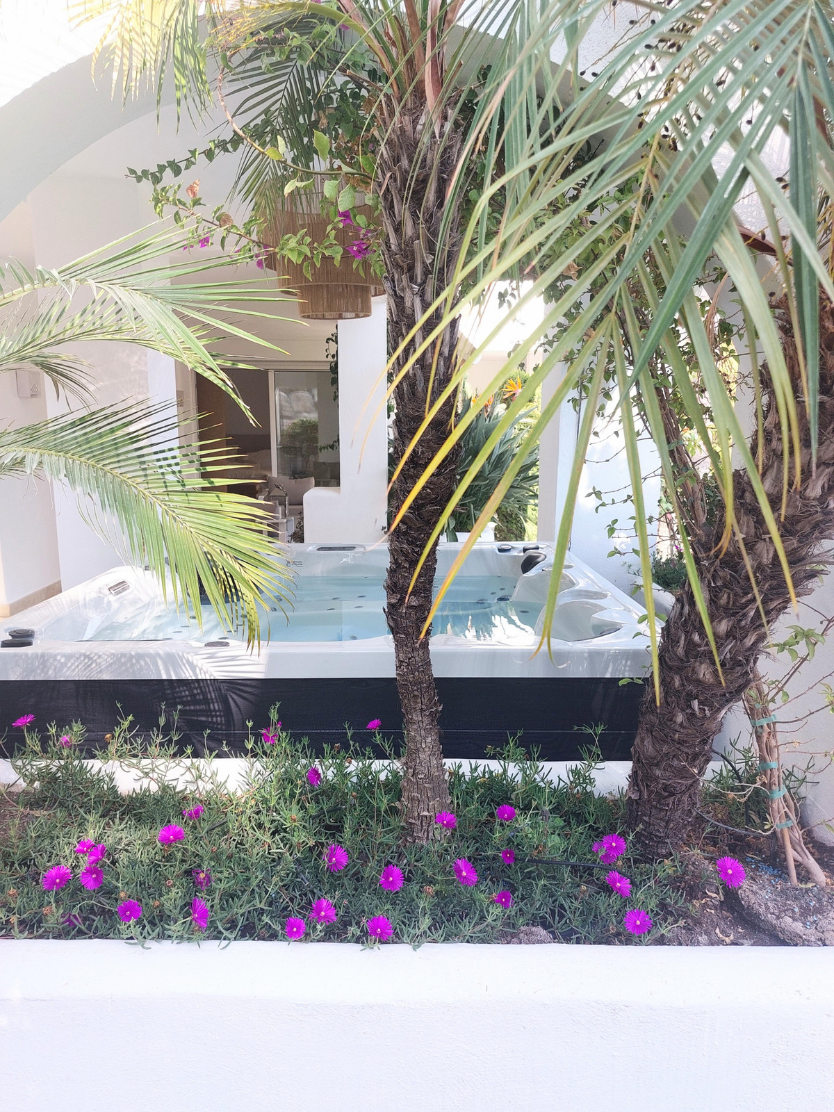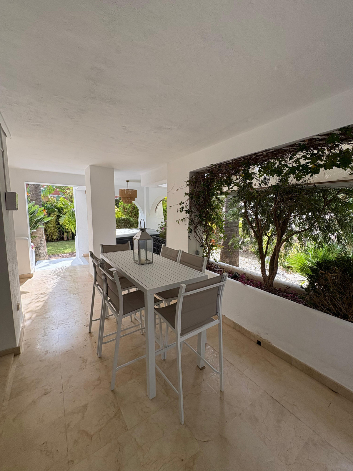 The property boasts a spacious layout of 245 m² with two en-suite bedrooms, a bright open-plan living and dining area, and a modern fully equipped kitchen. Large sliding doors connect the interior to a generous private terrace with a jacuzzi and direct access to lush tropical gardens, creating the perfect setting for entertaining or enjoying the sun all year round.