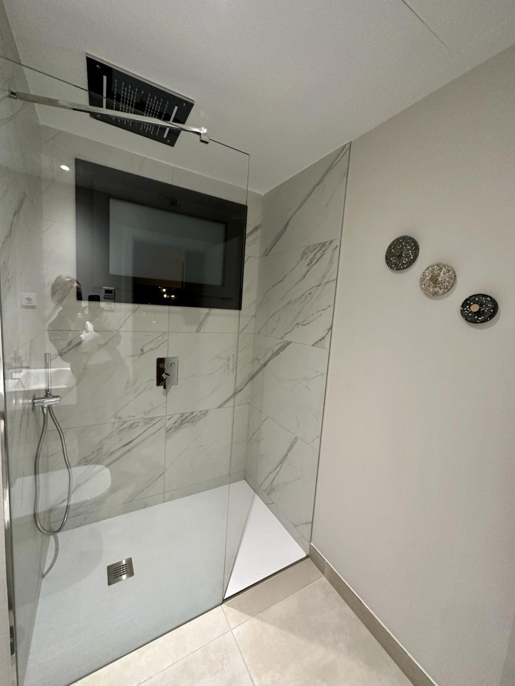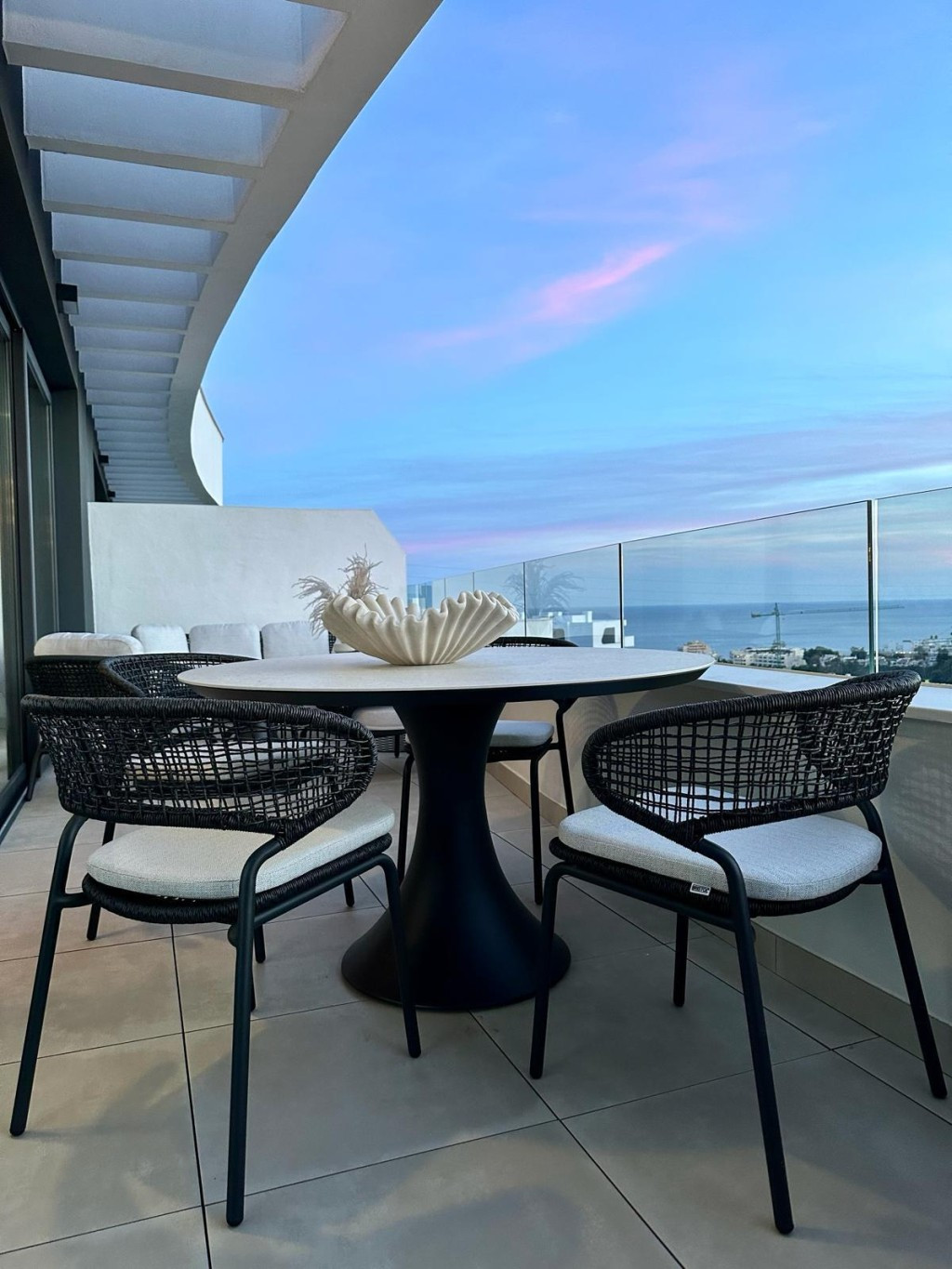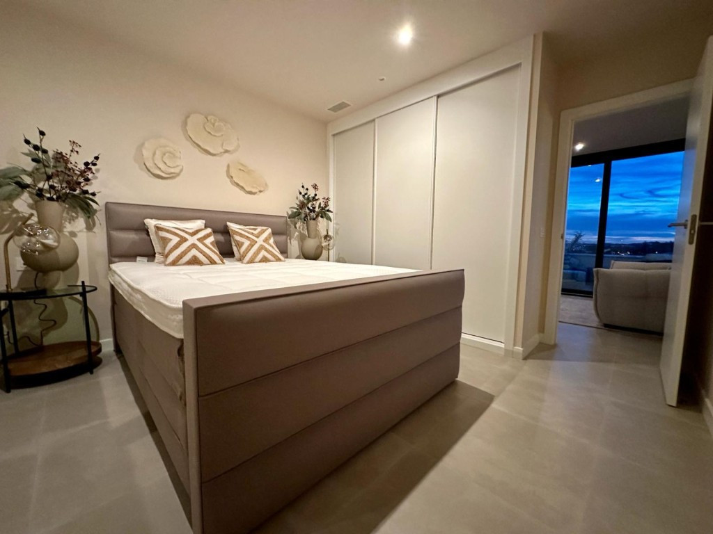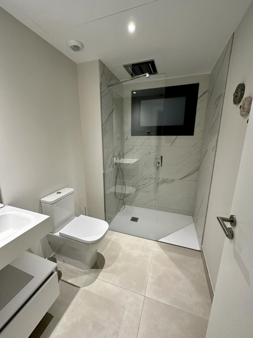 New built modern style penthouse in El Higueron en Fuengirola with two bedrooms and one bathroom, open plan kitchen, living room and with stunning terrace with panoramic sea views, sold furnished with quality furniture and including an exterior parking space, an underground parking space and a storage room. Air conditioning hot and cold via aerothermia, electric blinds in the living room, dim switches in all rooms, tv and internet connections in the living and bedrooms, underfloor heating and special tiles and rain shower in the bathroom. Gated complex with pools and facilities. The beach is a 15 minute walk away. The community allows holiday rentals.