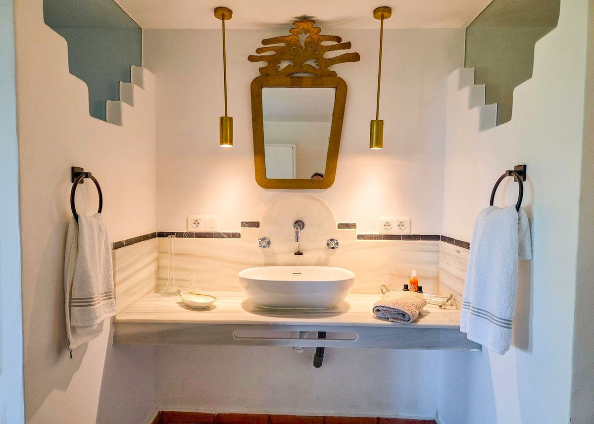 The villa comprises three spacious bedrooms, each with its own bathroom, while the master suite also includes a private sitting area. On the ground floor, a self-contained apartment offers full comfort and independence for guests, complete with its own kitchen and terrace.