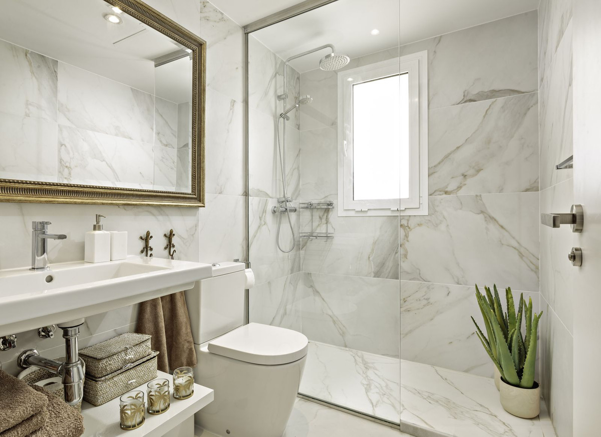 A sophisticated, modern stairway with a large window leads us upstairs to the master bedroom and a solarium. The master suite comes with ample built-in closets. The ensuite bathroom is done in black slabs with white veining, which, juxtaposed with the white sink and cabinetry, makes it simply stunning!! The solarium is ideal for sunbathing, as it is entirely private, with a high table where one can enjoy a snack and, undoubtedly, the incredible 360º views.
