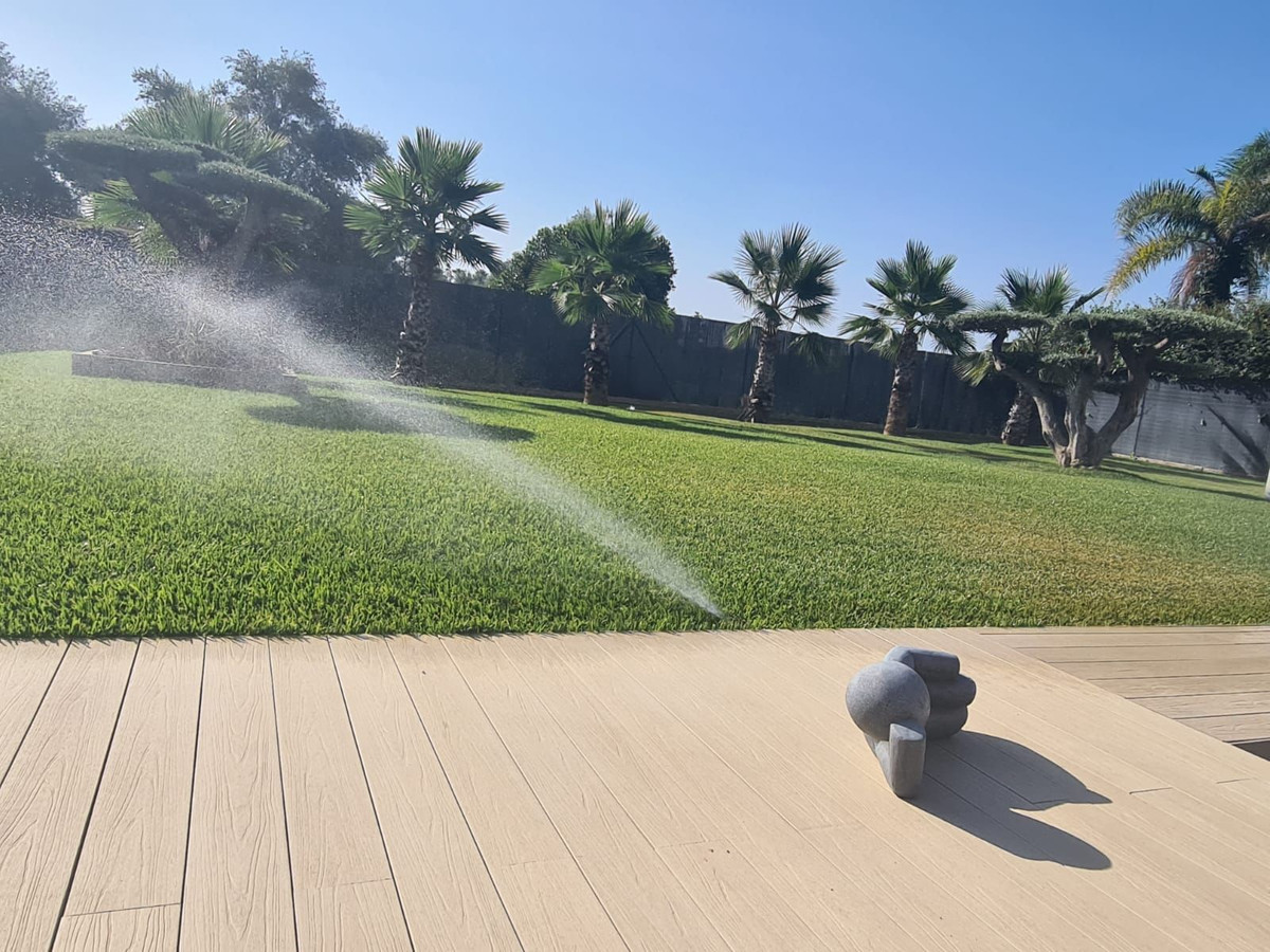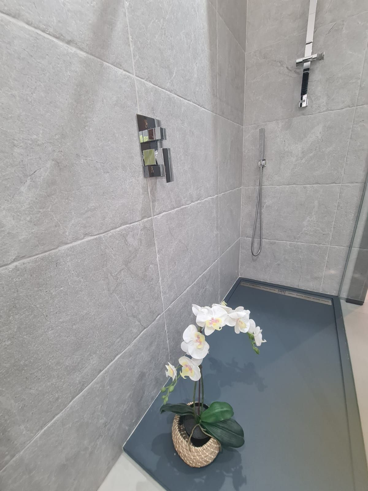Balinese-style swimming pool and shower, surrounded by synthetic wood-effect flooring.