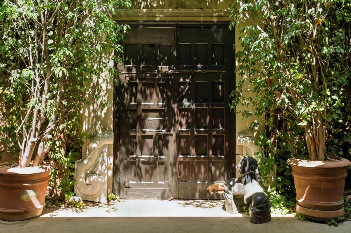 The exterior is equally impressive, featuring mature gardens with large perimeter trees that provide privacy, natural stone elements throughout — including columns, staircases, fireplaces, and fountains — and beautifully landscaped areas with a private ornamental pond and decorative obelisks. The grand natural stone entrance and antique wooden front door further emphasize the home’s distinctive Andalusian character.