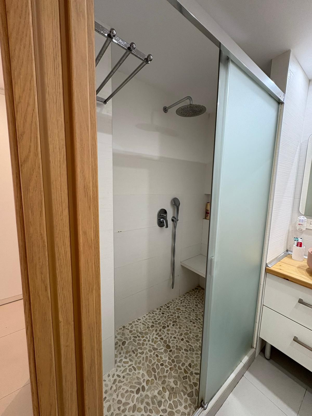 We present a welcoming, fully renovated apartment offering two bedrooms with built-in wardrobes and en-suite bathrooms, an open-plan kitchen/living room, and a terrace enclosed with folding security gates. The property is very comfortable, ready to move into, and is being sold partially furnished.