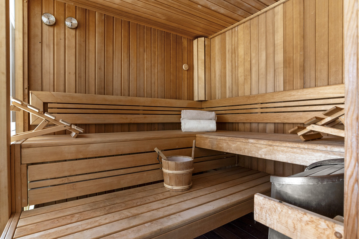 The wellness area includes a private gym, sauna, jacuzzi integrated into the floor, and a full bathroom, creating a perfect space for relaxation and wellbeing.