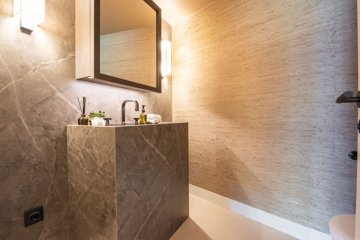 The outdoor spaces are equally impressive. Facing southwest, the terrace offers spectacular sunsets, along with panoramic views of the mountains, lush nature, and the Mediterranean Sea. A sleek modern outdoor kitchen and stylish al-fresco dining area make outdoor living effortless and enjoyable.