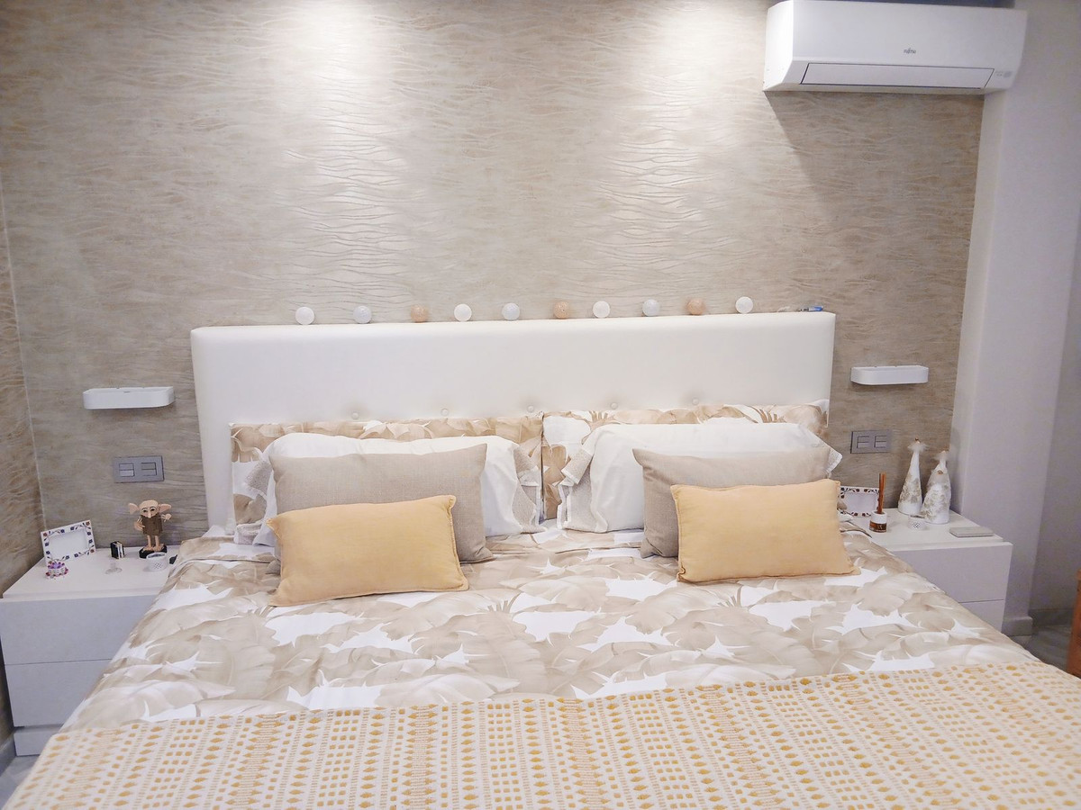 The master suite is a sanctuary of its own, featuring an en-suite bathroom with a contemporary glass partition that enhances natural light and visual openness. Waking up to the Mediterranean horizon becomes part of the daily ritual, with direct access to the terrace and its captivating vistas. The second bedroom, equally generous, contributes to an atmosphere of comfort, privacy and understated luxury. Every detail within the home — from the finishes to the lighting — has been thoughtfully curated to offer a lifestyle of refinement and ease.