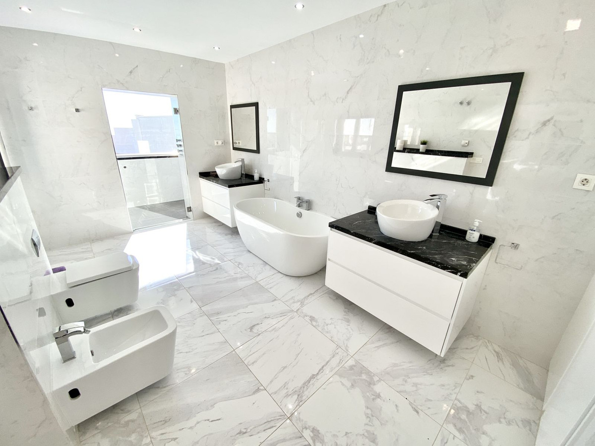 This stunning villa has lots of great outside entertaining areas including a beautiful main terrace from the lounge with heated swimming pool, entertaining area, separate covered modern kitchen and toilet. A further large family entertaining terrace / patio garden to the side. There is also a covered lounge area, sunny chill area and large roof solarium currently housing large jacuzzi. All have fabulous sea views.