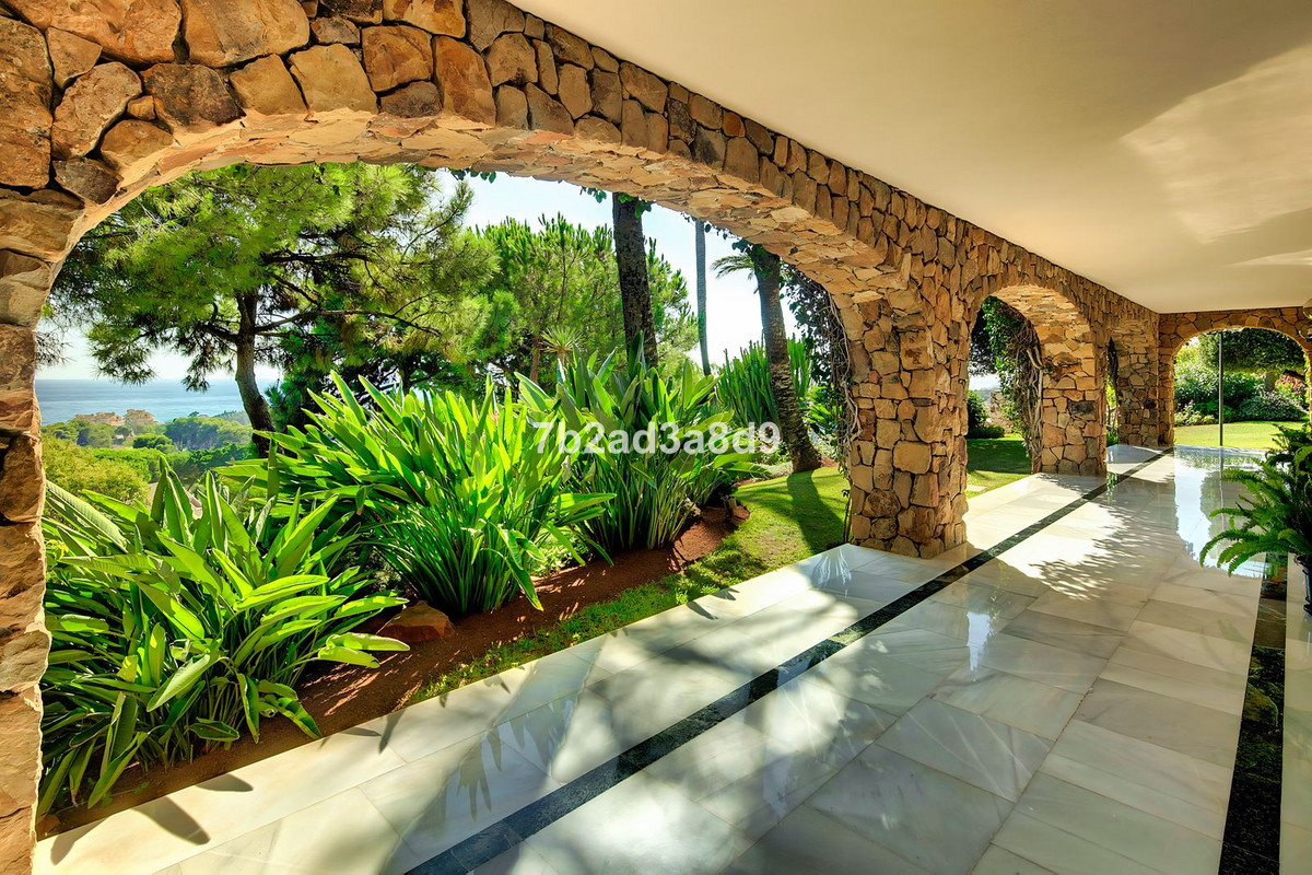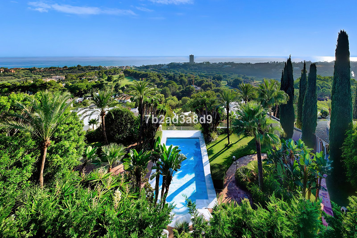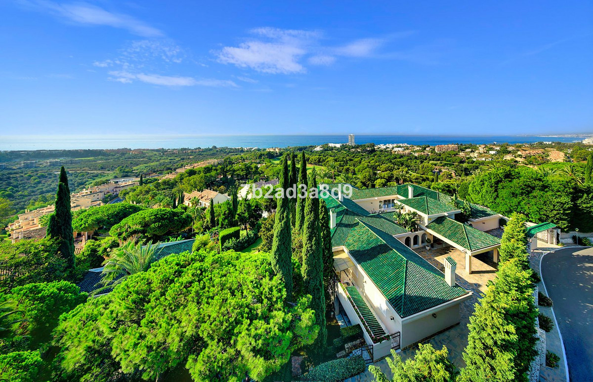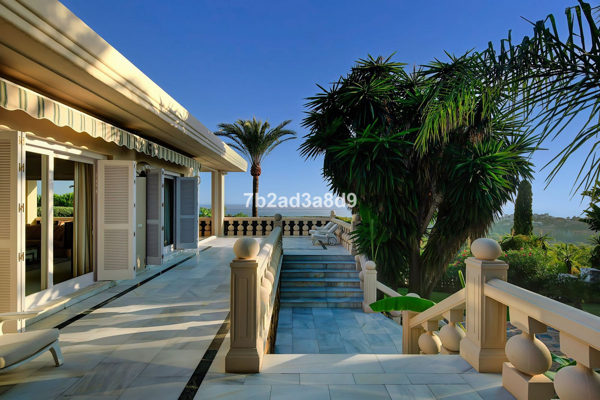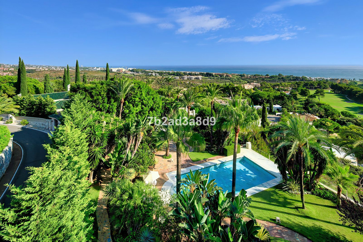 The property currently features ten bedrooms and ten bathrooms arranged within a timeless layout, complemented by multiple lounges, expansive terraces, and a pavilion ideal for wellness, entertaining, or a retreat-style bar. The main house includes a traditional central patio with a fountain, generous living and dining areas, and suites with direct access to the terraces and pool. A separate two-storey guest house offers additional bedrooms, lounges, and kitchen facilities, making it perfect for extended family or visitors. The estate further benefits from a four-car garage, beautifully landscaped gardens, and an impressive pool area designed to capture the spectacular sea and golf views.