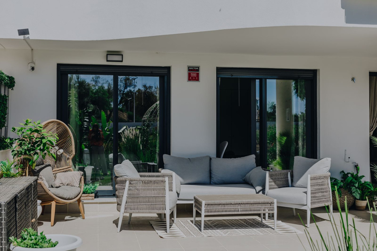 Modern ground-floor 2-bedroom apartment with amazing garden located in the exclusive Aranya development in Selwo, Estepona. The property is newly delivered, south-facing and sold fully furnished, offering bright interiors and a contemporary design. The open-plan living area connects directly to a spacious private terrace and a large garden, creating the perfect setting for outdoor dining, relaxation and entertaining.