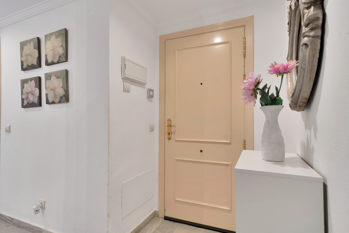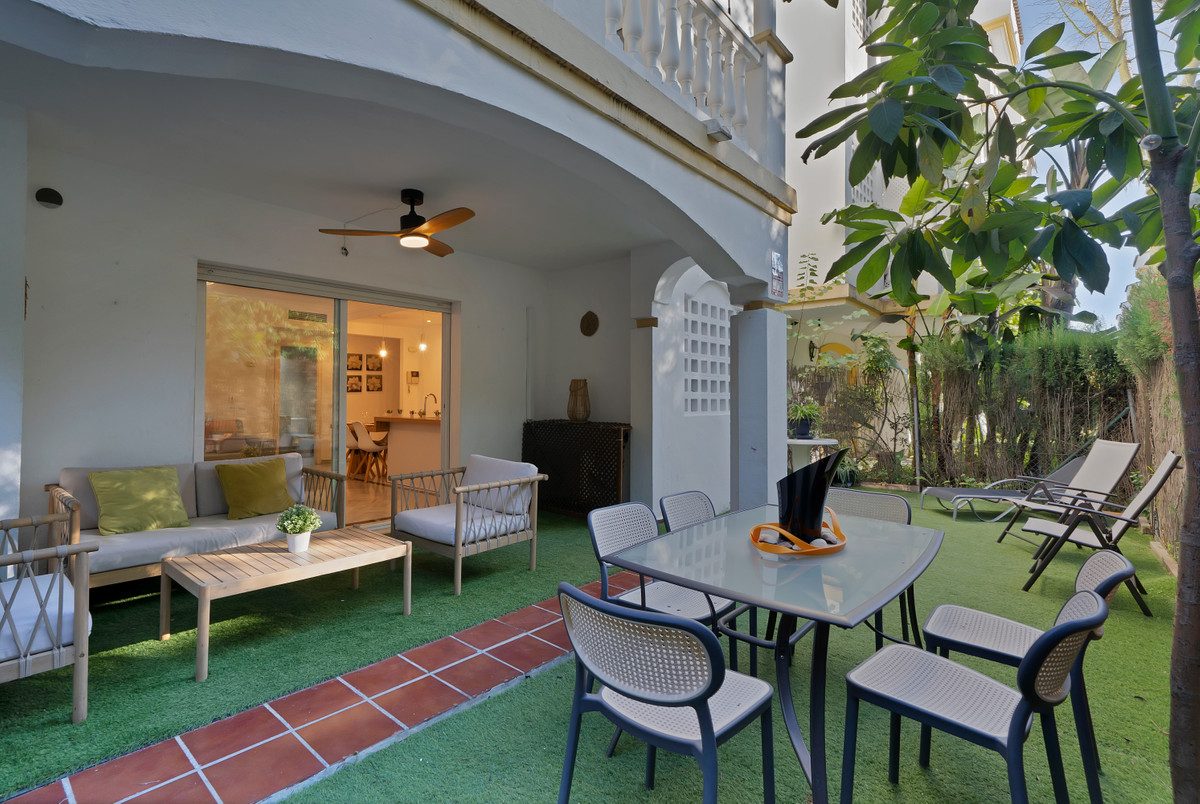 We present this beautiful property located in one of the most sought-after and prestigious areas of Marbella: the iconic Golden Mile, an enclave where luxury, comfort, and quality of life blend seamlessly.Just 800 meters from the beach, you can enjoy the Mediterranean with a pleasant 10-minute walk. The property is surrounded by all essential and high-end services: supermarkets, restaurants, national and international schools, institutes, pharmacies, bus stops, and the iconic Marbella Club and Puente Romano hotels. A privileged location that allows you to walk to the city centre and enjoy everyday life with total convenience.Connectivity is excellent: 5 minutes by car from Puerto Banús, the same distance from Marbella’s town centre and Old Town, and with immediate access to the motorway. Málaga Airport is only 35 minutes away.The property is located within a gated community built in 2002 that offers security, well-maintained gardens, a communal pool, and a paddle court—making this home a gem for those seeking comfort, style, and quality.This west-facing ground-floor apartment is perfect for enjoying the afternoon sun and features a charming 20 m2 porch and private garden, providing privacy and a cosy atmosphere.The total built area of 117 m2 is distributed as follows:•Spacious living-dining room filled with natural light•Modern open-plan kitchen, completely renovated in 2023•2 bedrooms and 2 full bathrooms•Private garden, ideal for relaxing or entertaining guestsAdditionally, it includes an underground parking space with direct access to the apartment via a lift, offering maximum convenience. The property is equipped with air conditioning, heating, and is adapted for people with reduced mobility.A unique opportunity thanks to its PREMIUM location on the Golden Mile. Perfect as an investment, holiday home, or permanent residence. High rental profitability due to strong demand in the area throughout the year. Ideal for those seeking to elevate their quality of life or invest in one of the most promising areas of the Costa del Sol.A property with Mediterranean charm, where modern comfort meets the exclusivity of Marbella.The abbreviated information document is available. Expenses: Taxes (ITP or VAT+AJD) + Notary and Land Registry fees.BRF