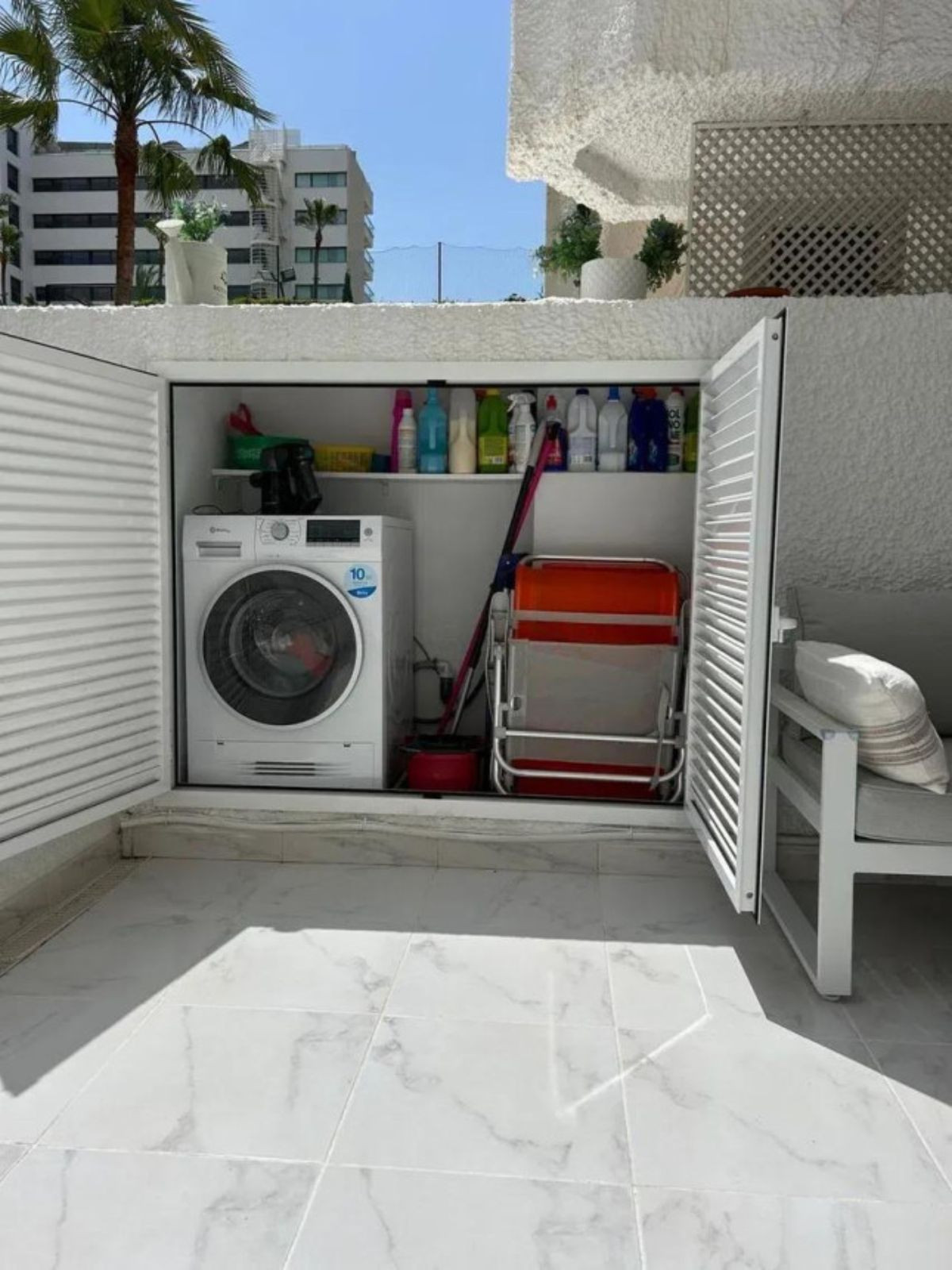 Appartement rénové à vendre. Une chambre, salle de bain neuve, cuisine américaine avec de nombreux rangements, deux placards intégrés, climatisation réversible et radiateurs électriques. Peinture lisse. Éclairage indirect à intensité réglable et spots encastrés pour créer différentes ambiances. Très lumineux. Prises design dissimulées. Sur la terrasse, un local technique a été aménagé pour la machine à laver et des rangements. L'appartement est équipé d'un lave-linge séchant. Store électrique. L'appartement offre une surface habitable de 58 m² et la terrasse de 30 m². Chauffe-eau neuf. L'eau est incluse dans les charges de copropriété. Possibilité d'aménager une deuxième chambre grâce à la grande surface habitable. Résidence calme conçue par l'architecte Fernando Higueras, avec jardin tropical, deux piscines, fontaines, rivière artificielle avec poissons, grenouilles et canards. Accès piéton direct à la plage, sans traverser la route. Deux douches sont à disposition pour se rincer après la plage. Accès direct à la piscine depuis la plage.