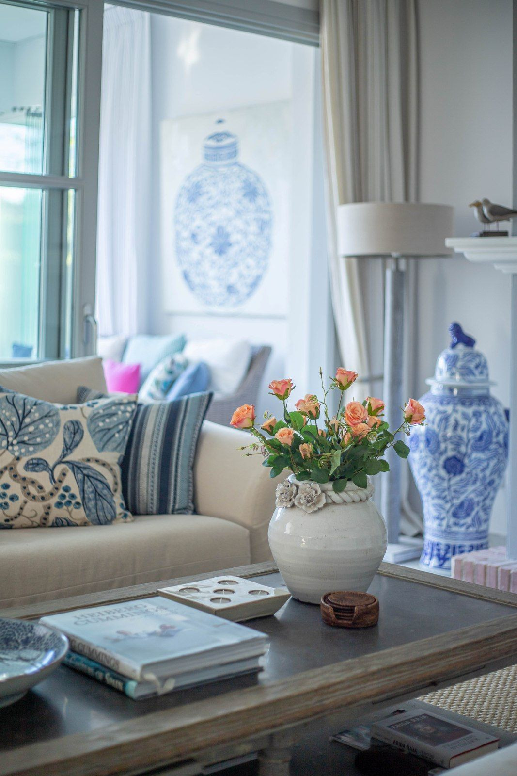 Plus loin, la pièce centrale de la maison s'ouvre sur un espace de vie comprenant salon, salle à manger et cuisine. Les baies vitrées laissent entrer une abondante lumière naturelle. L'agencement ouvert confère une impression d'espace particulièrement généreuse. La cuisine est entièrement équipée d'appareils modernes. La salle à manger est agrémentée d'une petite bibliothèque abritant une collection d'ouvrages internationaux, et le salon, agrémenté d'une cheminée, donne accès à la terrasse couverte. Celle-ci est divisée en un coin salon et un espace repas extérieur, offrant tous deux une vue imprenable sur le jardin et la piscine.