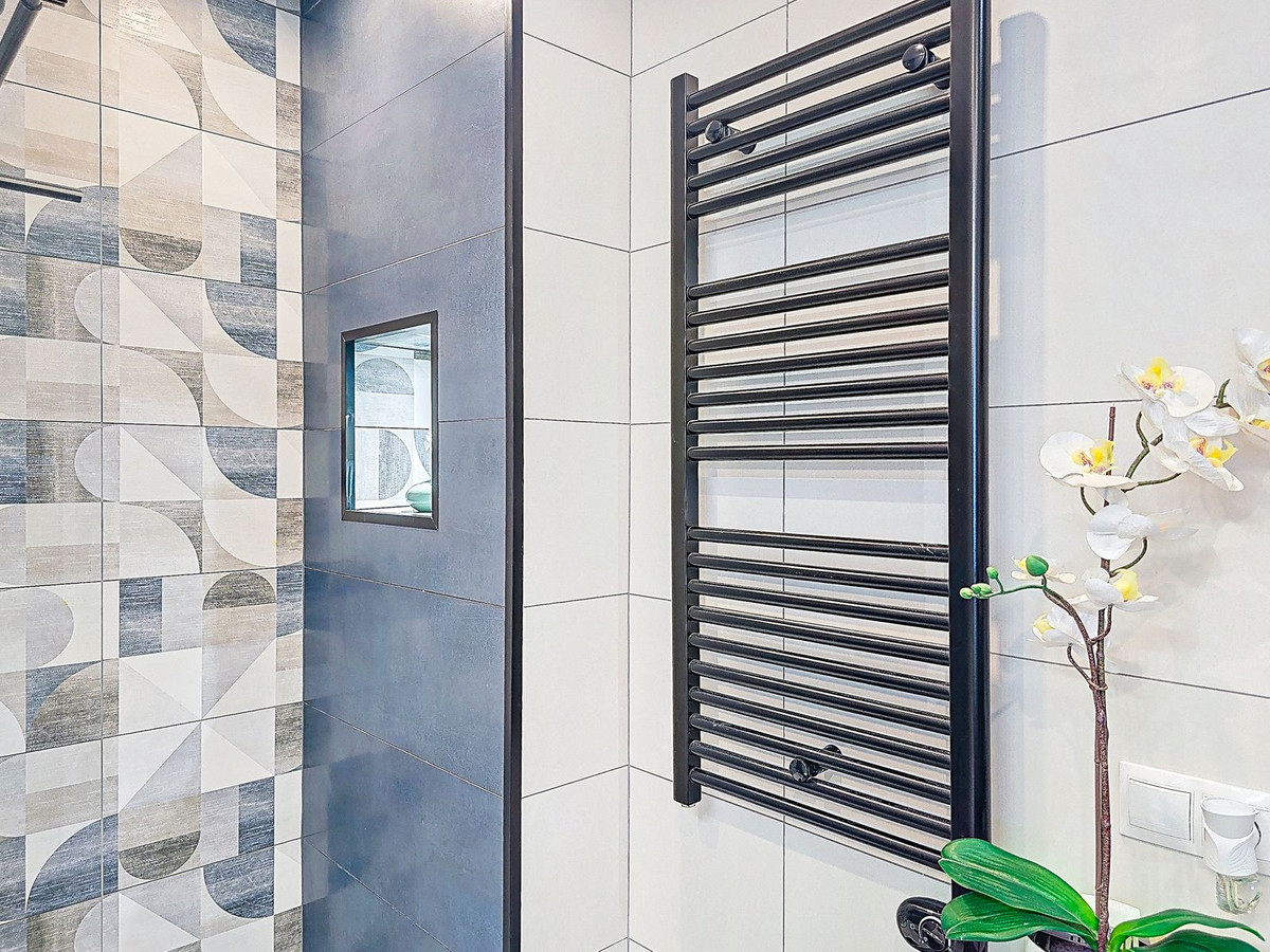Salle de bains avec douche à l'italienne effet pluie. La chambre principale est un studio magnifiquement meublé.