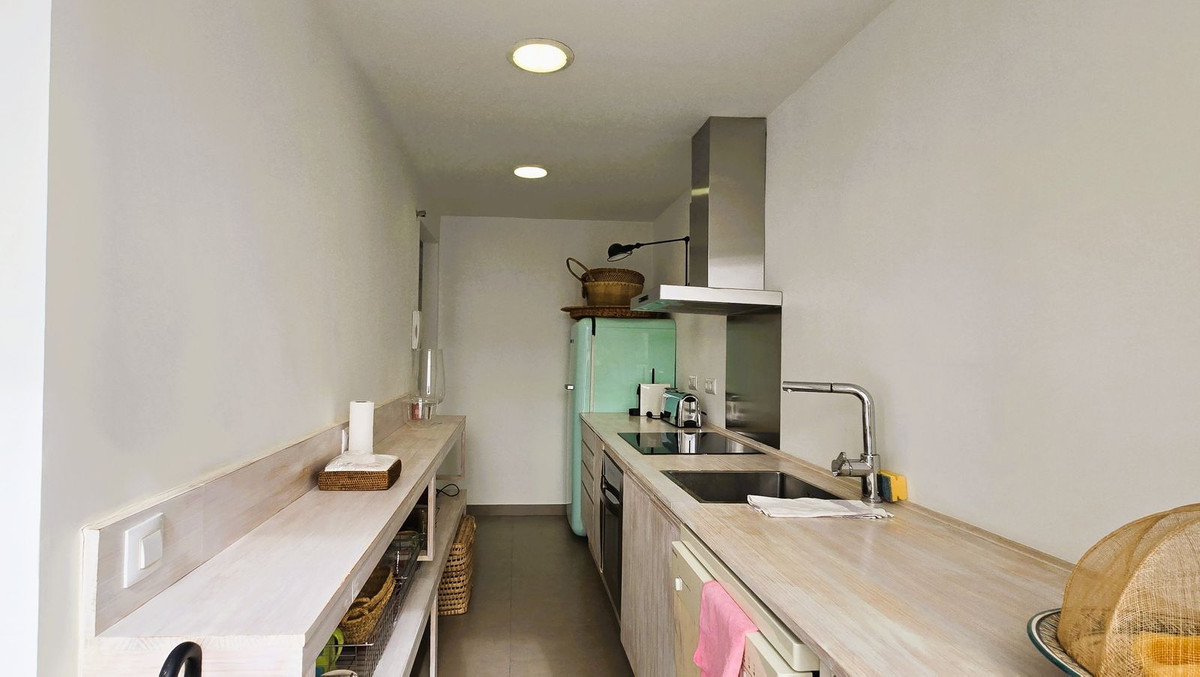 Cet appartement lumineux et aéré comprend un hall d'entrée, une cuisine spacieuse, un grand séjour et une chambre double avec salle de bains privative. La lumière naturelle inonde les pièces, accentuant la sensation d'espace.