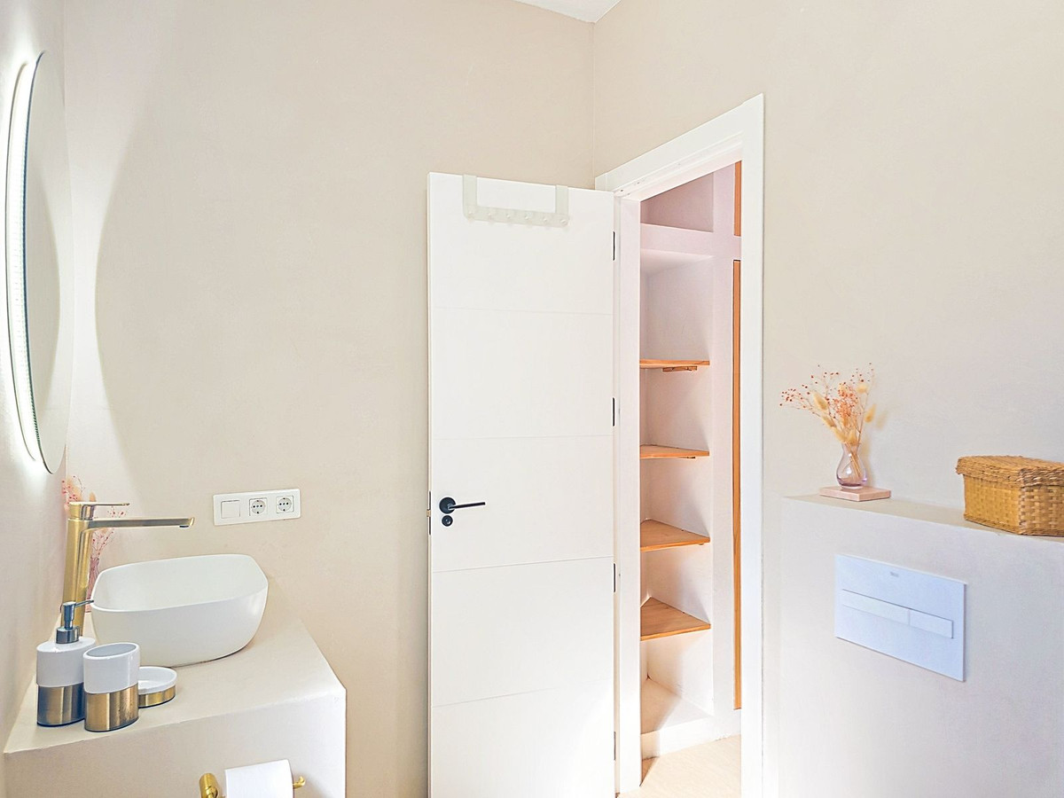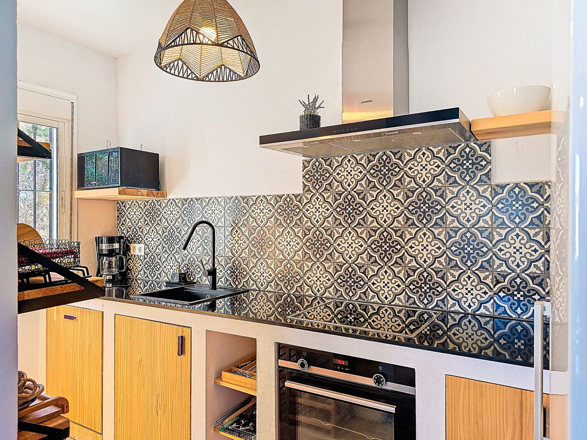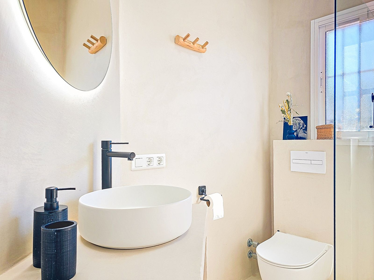La villa offre une surface habitable de 94 m² et comprend trois chambres, chacune climatisée et dotée de placards intégrés de style ibicenco. Elle dispose de deux salles de bains avec douches à l'italienne, dont une attenante à la chambre principale. La cuisine entièrement équipée, également de style ibicenco, comprend un réfrigérateur, un congélateur, une plaque de cuisson vitrocéramique, un four électrique, un micro-ondes et un lave-vaisselle. Le salon lumineux est climatisé et agrémenté d'une cheminée. Il donne directement sur la vaste terrasse et la piscine.