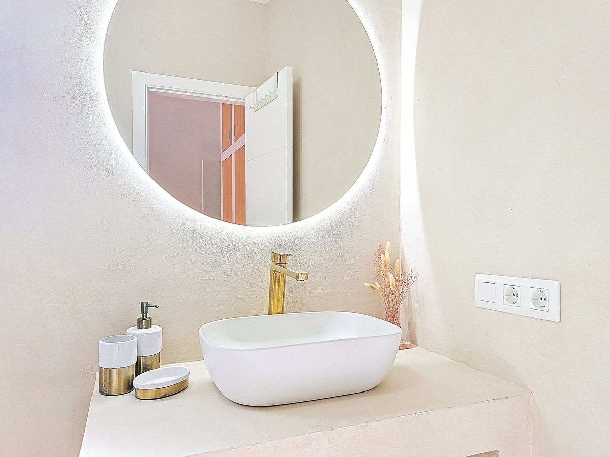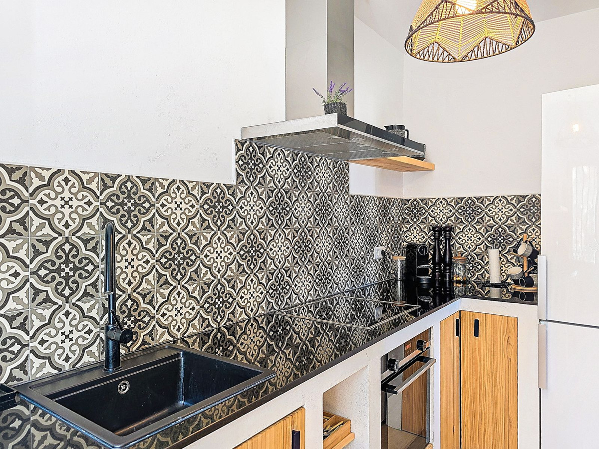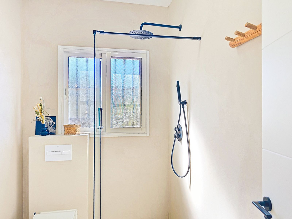 La villa offre une surface habitable de 94 m² et comprend trois chambres, chacune climatisée et dotée de placards intégrés de style ibicenco. Elle dispose de deux salles de bains avec douches à l'italienne, dont une attenante à la chambre principale. La cuisine entièrement équipée, également de style ibicenco, comprend un réfrigérateur, un congélateur, une plaque de cuisson vitrocéramique, un four électrique, un micro-ondes et un lave-vaisselle. Le salon lumineux est climatisé et agrémenté d'une cheminée. Il donne directement sur la vaste terrasse et la piscine.