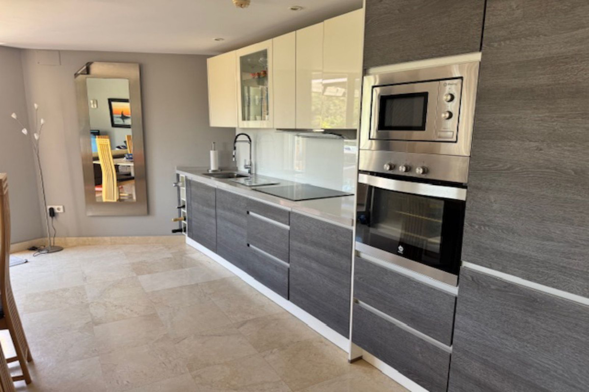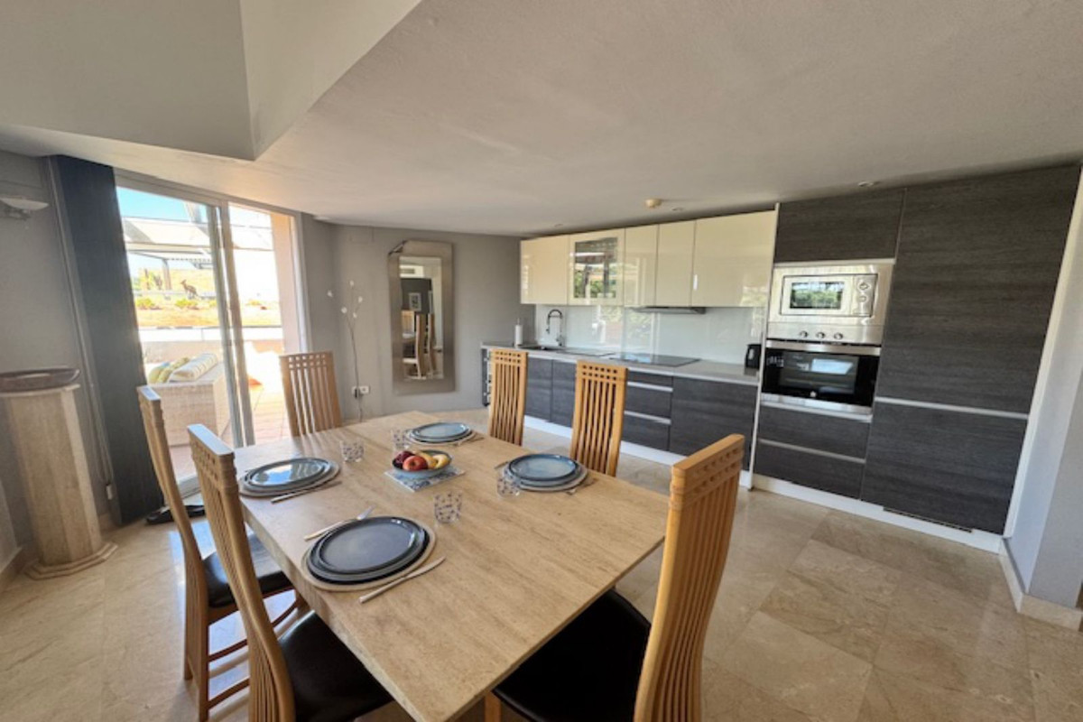 Ce penthouse de luxe exceptionnellement spacieux et lumineux, orienté plein sud, comprend deux chambres et se situe au sein du complexe résidentiel de prestige Riviera del Sol, superbement entretenu et jouxtant le prestigieux club-house du golf de Miraflores. Il se compose d'un très grand séjour/salle à manger, d'une cuisine américaine entièrement équipée, de deux chambres doubles, de deux salles de bains (dont une attenante) et d'une vaste terrasse panoramique offrant une vue imprenable sur le golf, les montagnes et les jardins communs. Le séjour bénéficie de magnifiques baies vitrées du sol au plafond sur deux côtés, tandis que la chambre principale dispose de grands placards intégrés avec portes-fenêtres et d'un accès à la terrasse. Cet appartement aux finitions haut de gamme est doté de sols en marbre, d'une salle de bains entièrement carrelée en marbre, de la climatisation réversible, d'un interphone vidéo, de la télévision par satellite, d'une alarme, etc. Ce complexe paisible possède de superbes jardins tropicaux parfaitement entretenus, agrémentés d'un bassin. Il comprend également une grande piscine avec espace bar, une pataugeoire, une salle de sport et un sauna. Un emplacement de parking souterrain et un espace de rangement sont inclus.