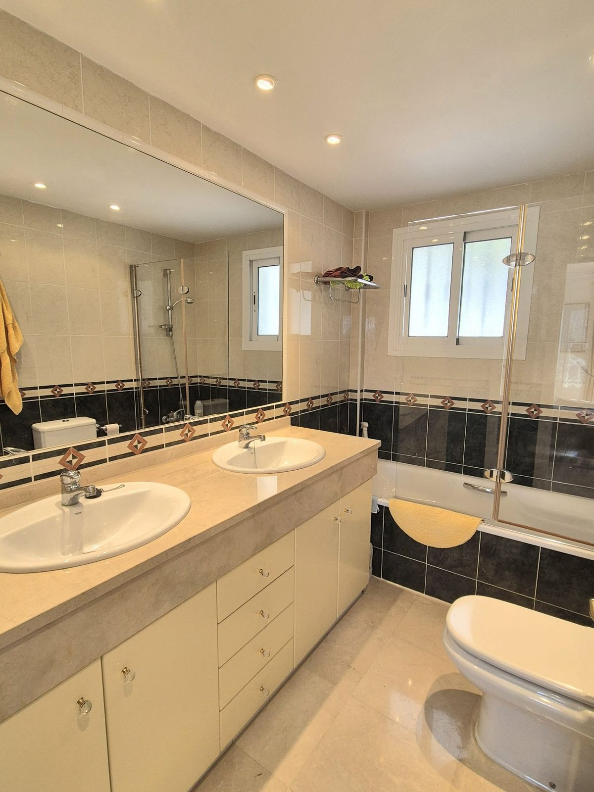 Vous accédez à la propriété par le portail privé, où se trouve votre propre place de parking. Quelques marches vous mènent au niveau principal où se trouvent la maison et les terrasses. Vous disposez d'une grande terrasse avant facile d'entretien avec des parterres de fleurs équipés d'un système d'arrosage automatique, ainsi que d'une terrasse couverte avec un agréable coin salon et une vue imprenable sur le golf, les montagnes et le coucher du soleil. La propriété est répartie sur deux niveaux. En entrant, à gauche, vous trouverez une salle de bain complète, l'escalier menant au deuxième niveau et un espace de rangement sous l'escalier. En face de vous se trouve une grande cuisine entièrement équipée avec une porte donnant accès à la terrasse arrière. À droite du couloir se trouve le grand séjour/salle à manger climatisé, doté de deux portes-fenêtres coulissantes ouvrant sur la terrasse avant. À l'étage, en face de vous, se trouve la suite parentale avec placards intégrés, terrasse privative et salle de bain complète. À gauche du couloir se trouvent les deux autres chambres doubles avec placards intégrés et une salle de bain à partager. La maison est équipée de deux climatiseurs réversibles centralisés.