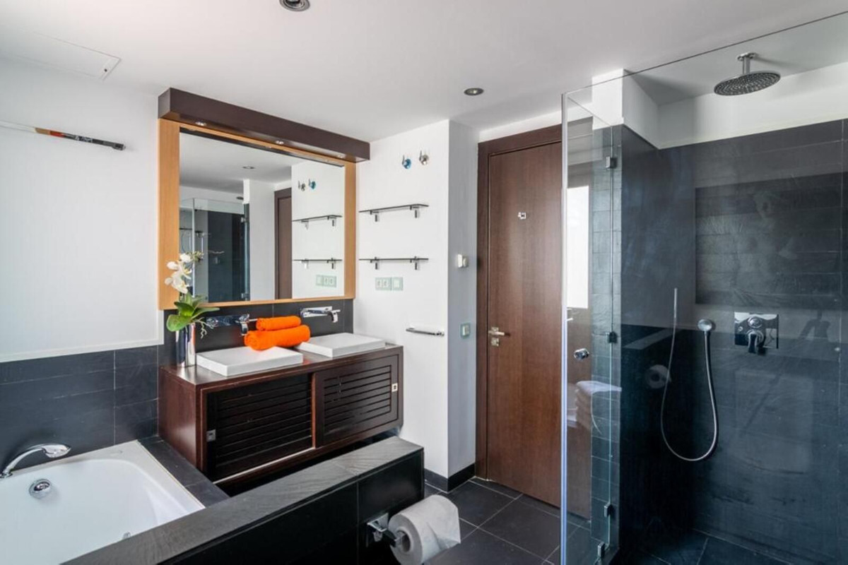 Cet appartement comprend deux chambres avec salles de bains privatives, dont la chambre principale. La troisième chambre dispose d'une salle de bains indépendante faisant également office de toilettes invités. Vendu entièrement meublé.