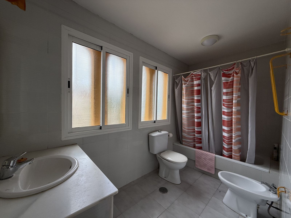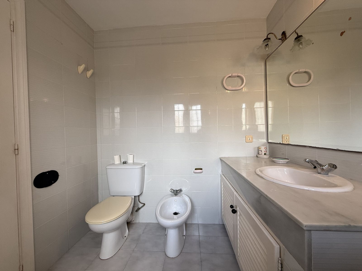 La chambre principale dispose d'une salle de bains attenante avec placards intégrés du sol au plafond, vue sur la mer, la Torre La Sal et la baie de Casares, ainsi que d'une salle de bains spacieuse avec fenêtre.