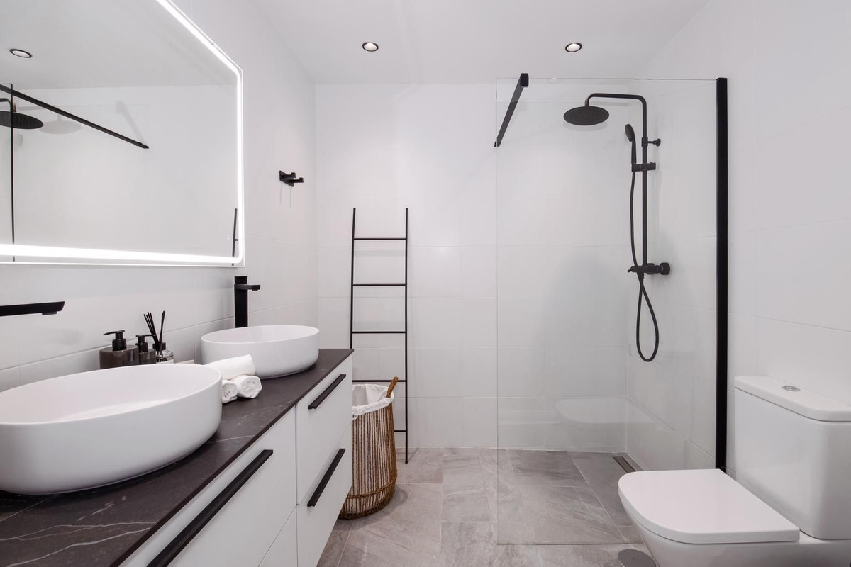 Cette propriété offre deux chambres magnifiquement aménagées, dont une suite parentale paisible avec accès direct à la terrasse et une élégante salle de bains privative. Les deux salles de bains bénéficient de finitions exceptionnelles, avec douches à l'italienne à effet pluie, robinetterie contemporaine, meubles vasques suspendus et éclairage LED d'ambiance. Une buanderie/cellier séparée apporte un confort supplémentaire à cette maison raffinée.