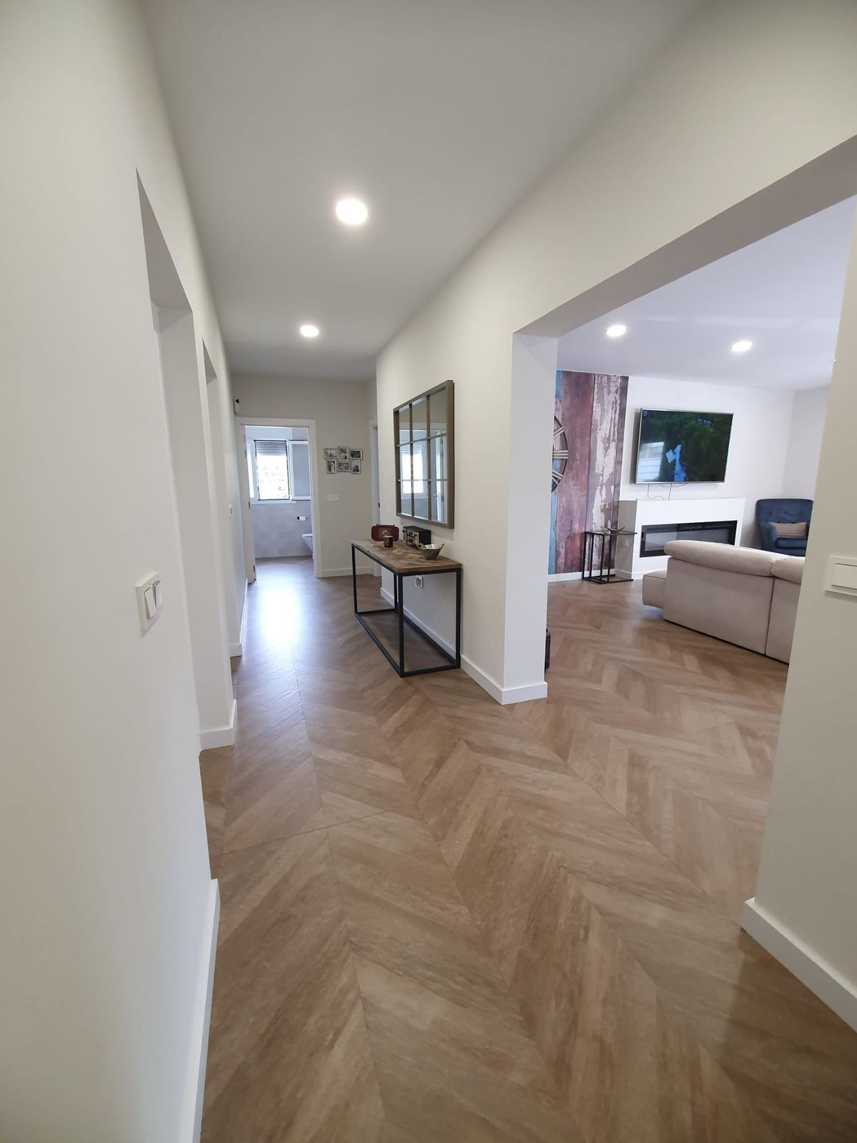 En entrant par la façade, vous découvrirez une agréable véranda donnant sur la piscine, offrant un espace généreux pour un salon de jardin ou un coin repas. À l'intérieur, un hall spacieux s'ouvre sur un nouveau sol en céramique imitation parquet qui se prolonge dans toutes les pièces. Le vaste salon est équipé d'une cheminée électrique moderne de 180 cm, de la climatisation et d'un espace repas. Les deux grandes chambres doubles sont climatisées. L'une d'elles dispose d'une magnifique salle de bains privative avec une élégante baignoire et douche de style victorien. Une salle de bains familiale rénovée se trouve à l'arrière de la maison. La cuisine moderne, spacieuse et élégante, est dotée de plans de travail, de placards et d'électroménagers haut de gamme. Toutes les pièces sont équipées de portes blanches modernes neuves, de fenêtres à double vitrage avec moustiquaires et stores.