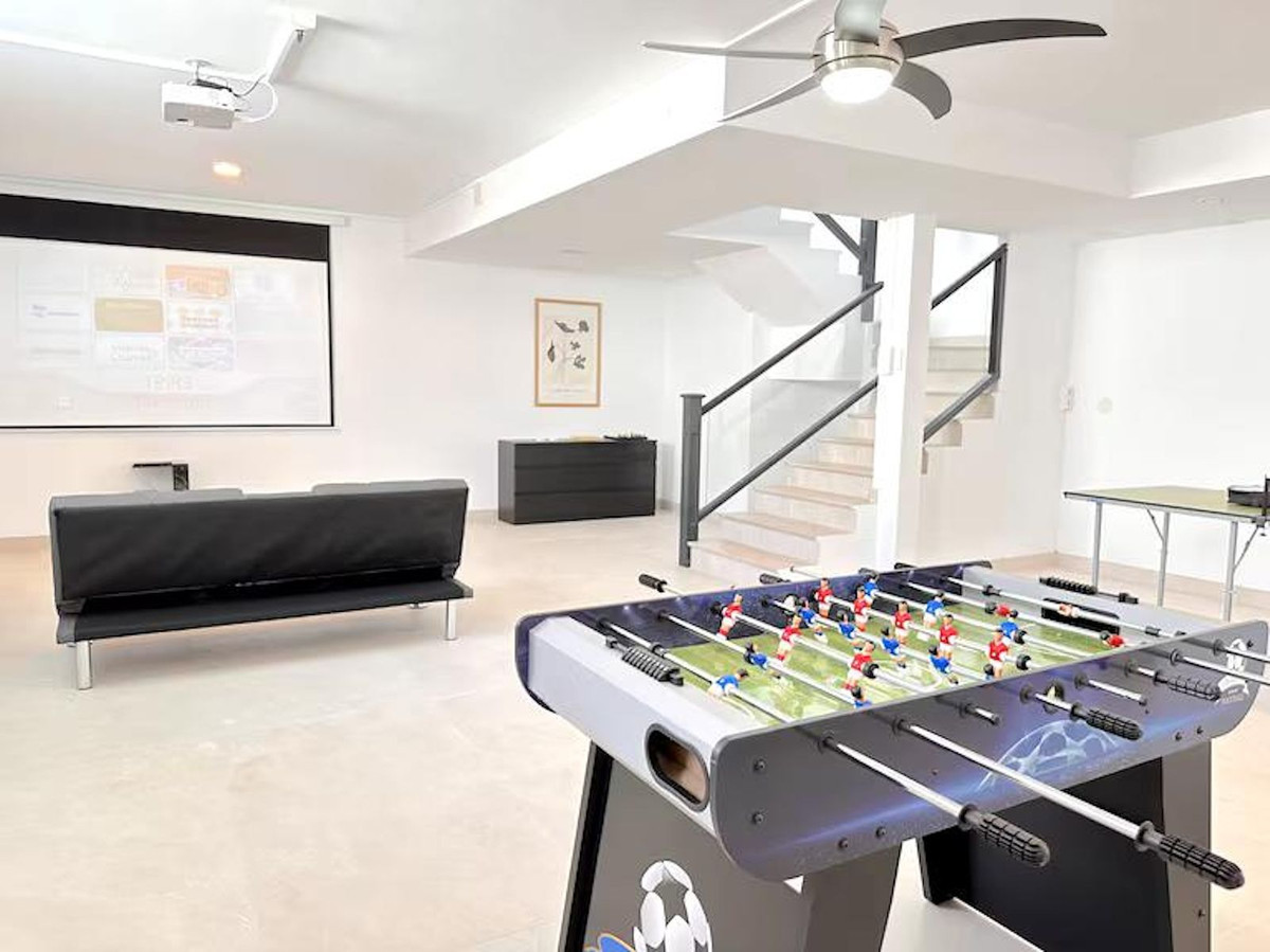 Au niveau inférieur se trouve un vaste espace polyvalent actuellement aménagé en salle de cinéma et salle de jeux, avec une salle de douche complète. Cet espace était initialement conçu pour être transformé en un appartement indépendant de deux chambres avec cuisine et salle de bains ; les installations de plomberie et d'électricité sont déjà en place. Par ailleurs, un espace de 20 m² sous la terrasse avant était prévu pour accueillir une salle de sport.