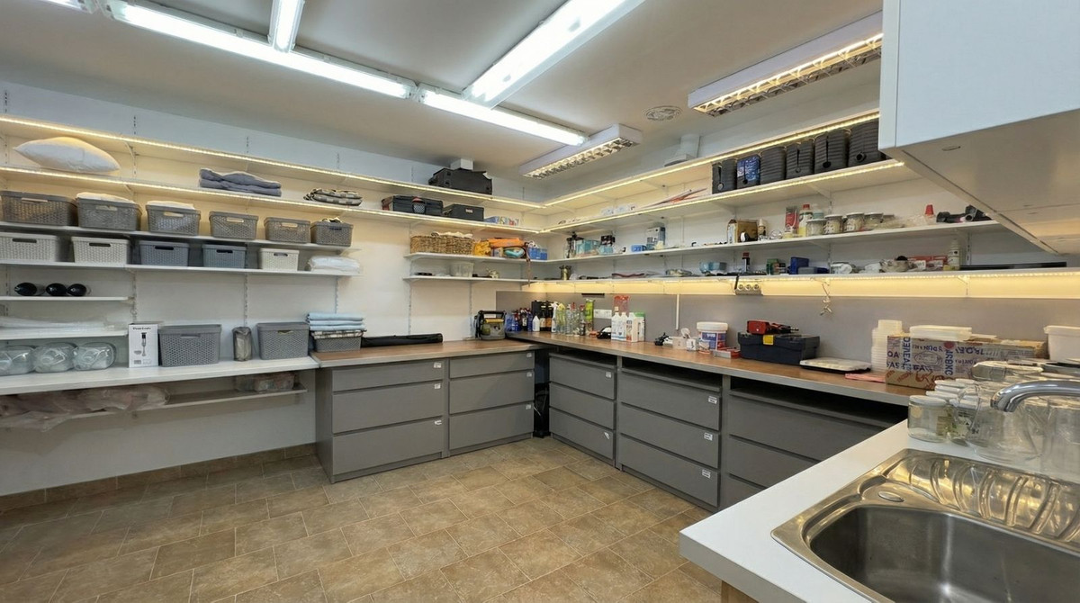 Un escalier en marbre mène au niveau inférieur. On y trouve un appartement d'invités avec salle de bains privative et une cuisine spacieuse. Attenant à cet appartement, en traversant le vaste garage (55 m² !), se trouve une quatrième chambre, pouvant également servir de bureau. Ce niveau abrite également le local technique (avec la pompe de la piscine) et un espace de rangement/atelier de 30 m². Grâce à l'espace disponible et à la plomberie existante, cet étage offre de nombreuses possibilités d'aménagement de deux ou trois chambres d'hôtes supplémentaires, idéal pour ouvrir une maison d'hôtes.